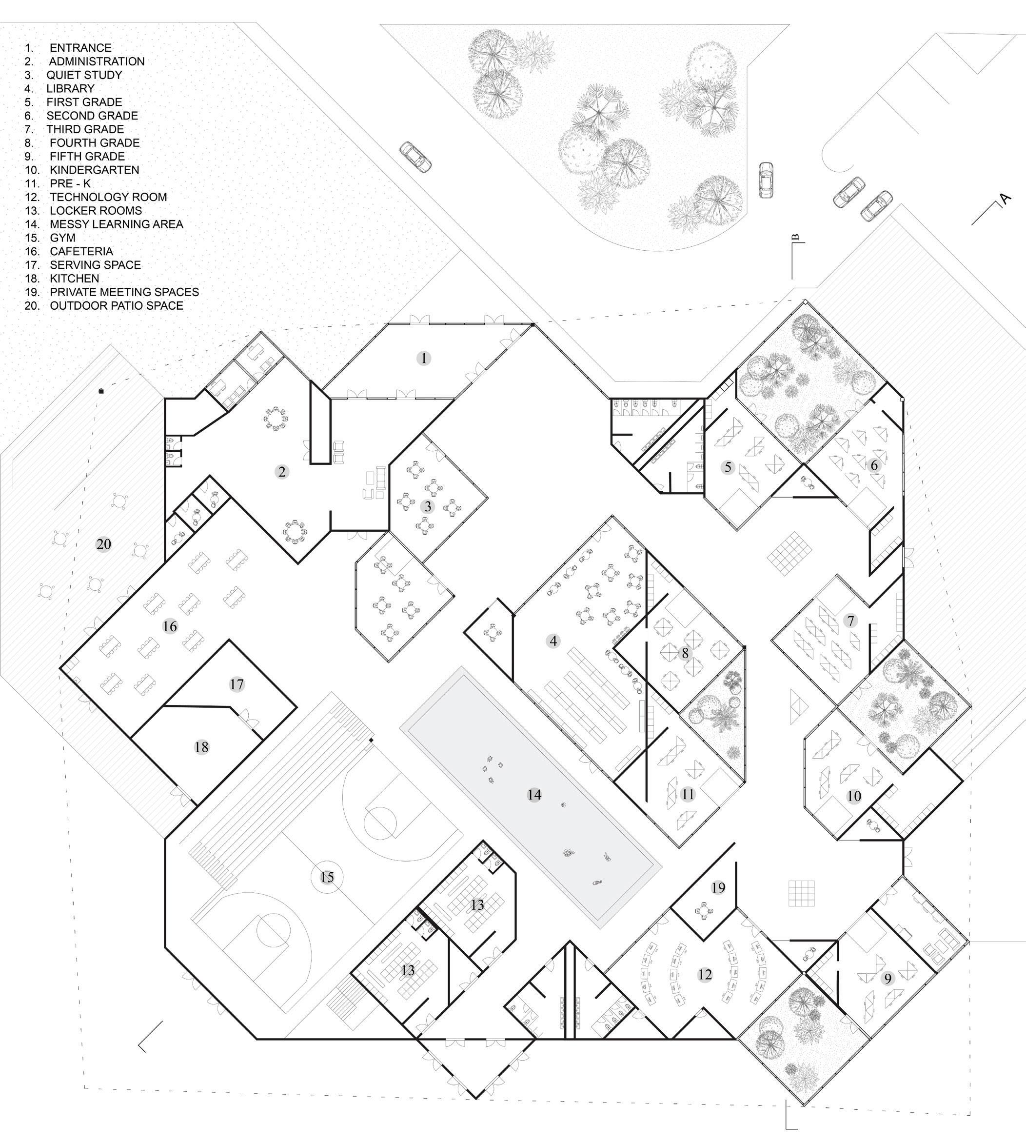 Inspired by the Open-Air Amsterdam School, my design centers around a flexible core of classrooms, with surrounding programs for diverse activities. The diamond-shaped classrooms tessellate across the ground floor, creating a variety of collaborative and private spaces. The roof, influenced by the Louvre Abu Dhabi, features a free-flowing pattern that expands and contracts based on the function of the spaces below. This dynamic design allows for soft, diffused light in classrooms and study areas, while providing ample natural light in more active areas like workshops and the gym.