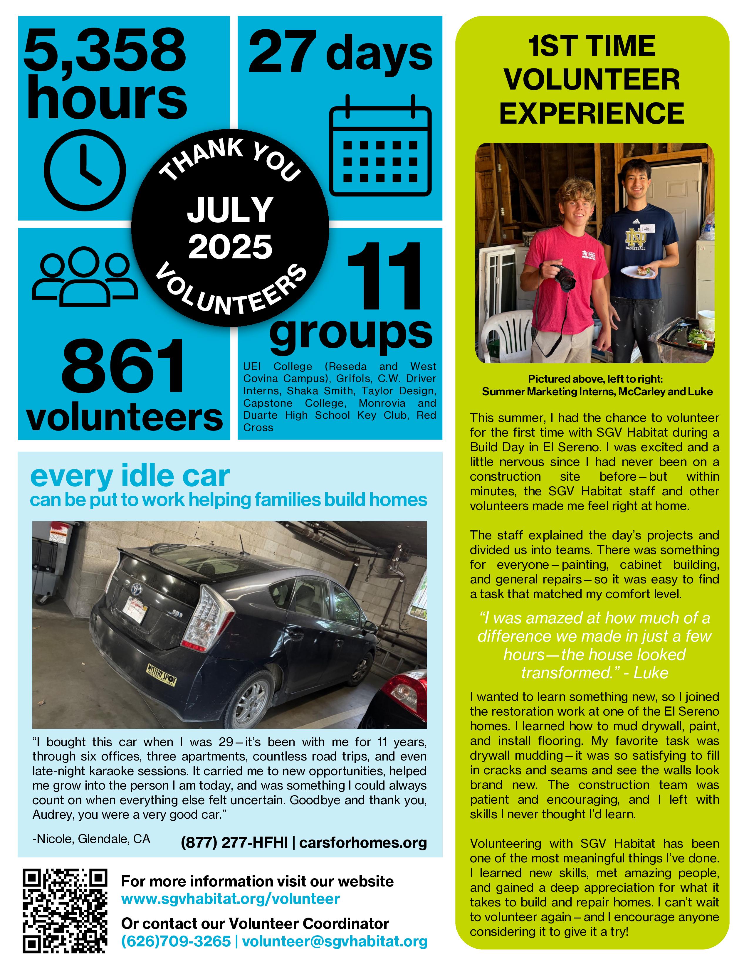 Quarterly publication from San Gabriel Valley Habitat for Humanity - Summer Edition. Featuring El Sereno Home Dedication, Restoring Mary's Home in Altadena, Recap of Wall Build event, Volunteer highlights and ReStore distribution events impact on the local community.