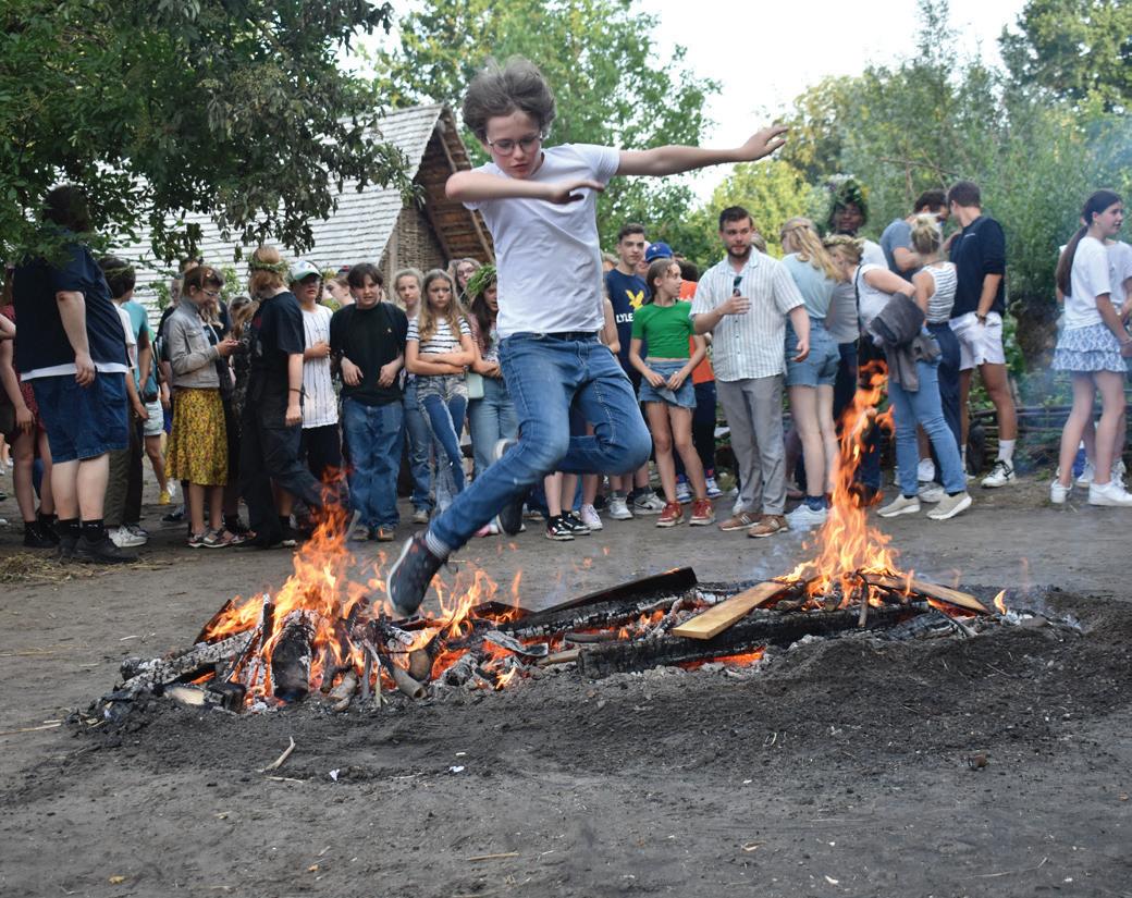 Eindelijk! Na jaren van niet mogen of niet kunnen, mocht en kon het weer: samen het vrolijkste van alle jaarfeesten vieren. Op 23 juni vormde het Prehistorisch Dorp het ideale decor voor het midzomerfeest Sint Jan. Het werd een feest waar we vaak met plezier aan zullen terugdenken. Een nieuwe locatie, prachtig weer en een geweldig aanbod aan spellen en activiteiten zorgden ervoor dat we Sint Jan dit jaar weer uitbundig hebben gevierd. Met Sint Jan (de exacte datum is 24 juni) vieren we het begin van een nieuwe periode. Het is midzomer, de zon staat hoog aan de hemel en we worden verleid om ons over te geven aan licht, warmte en buitenlucht. ‘Geniet, maar verlies jezelf niet’, is het motto van dit feest, dat bestaat uit ontmoeten, gezamenlijk eten, zingen en spelen en dat traditioneel wordt afgesloten door het vuurspringen.