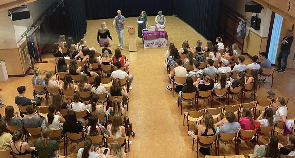 Woensdag 14 juni was dit jaar ook op het Novalis een spannende dag voor tientallen eindexamenkandidaten. Eindelijk kwam dan toch dat verlossende of gevreesde telefoontje. Dé boodschap vanuit school die voor elke deelnemer blijdschap of teleurstelling brengt, waarna vele emotionele reacties via sociale media de wereld ingeslingerd worden. Het is deze boodschap die ’s middags de kandidaten in de aula samenbracht. De leerlingen werden ontvangen met (alcoholvrije) champagne,