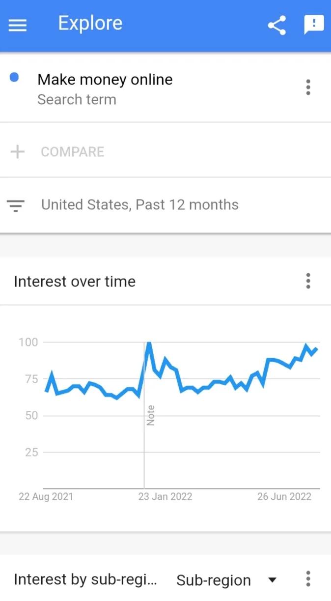 ChoosecountryforwhichcountrythatwanttoseeItwillshowyouhowmuchyour nicheistrendingandhowmanypeoplearesearchingformakemoneyonlineon Google.Youcanalsoselectaspecificyeartofind.