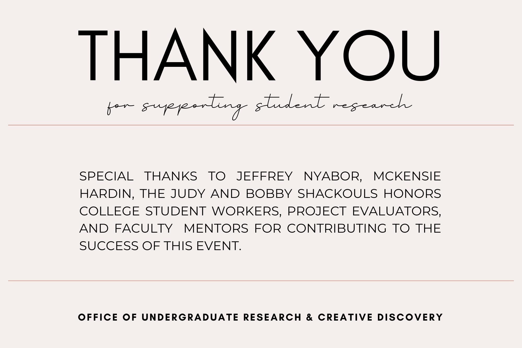 Over the course of today, you will have the opportunity to share your research, engage with peers and faculty, and gain valuable insights from a diverse array of disciplines. This showcase is a testament to the hard work, creativity, and commitment to academic excellence of everyone involved, from presenters and research mentors to evaluators and attendees to organizers and sponsors.