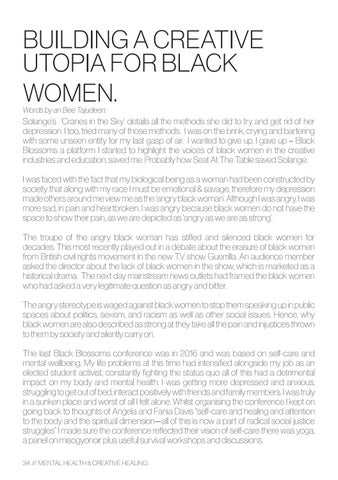 Solange’s ‘Cranes in the Sky’ details all the methods she did to try and get rid of her depression. I too, tried many of those methods. I was on the brink, crying and bartering with some unseen entity for my last gasp of air. I wanted to give up, I gave up – Black Blossoms a platform I started to highlight the voices of black women in the creative industries and education, saved me. Probably how Seat At The Table saved Solange. I was faced with the fact that my biological being as a woman had been constructed by society that along with my race I must be emotional & savage, therefore my depression made others around me view me as the ‘angry black woman’. Although I was angry, I was more sad, in pain and heartbroken. I was angry because black women do not have the space to show their pain, as we are depicted as ‘angry as we are as strong’. The troupe of the angry black woman has stifled and silenced black women for decades. This most recently played out in a debate about the erasure of black women from British civil rights movement in the new T.V show Guerrilla. An audience member asked the director about the lack of black women in the show, which is marketed as a historical drama. The next day mainstream news outlets had framed the black women who had asked a very legitimate question as angry and bitter. The angry stereotype is waged against black women to stop them speaking up in public spaces about politics, sexism, and racism as well as other social issues. Hence, why black women are also described as strong at they take all the pain and injustices thrown to them by society and silently carry on. The last Black Blossoms conference was in 2016 and was based on self-care and mental wellbeing. My life problems at this time had intensified alongside my job as an elected student activist, constantly fighting the status quo all of this had a detrimental impact on my body and mental health. I was getting more depressed and anxious, struggling to get out of bed, interact positively with friends and family members. I was truly in a sunken place and worst of all I felt alone. Whilst organising the conference I kept on going back to thoughts of Angela and Fania Davis “self-care and healing and attention to the body and the spiritual dimension—all of this is now a part of radical social justice struggles” I made sure the conference reflected their vision of self-care there was yoga, a panel on misogyonoir plus useful survival workshops and discussions. 34 // MENTAL HEALTH & CREATIVE HEALING.