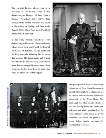 The earliest known photograph of a president of the United States is this daguerreotype likeness of John Quincy Adams (President 1825‐1829). This portrait of the former President was taken at the gallery of Bishop and Gray, early August 1843, Utica, New York. President Adams was 76 years old. In his diary Adams remarked, “Four daguerreotype likenesses of my head were taken, two of them jointly with the head of Mr. Bacon. All hideous.” Adams continued his diary entry the following day, “At seven this morning Mr. Bacon came and I went with him to the Shadow Shop, where three more Daguerreotype likeness were taken of me, no better than those of yesterday. They are all too true to the original.”