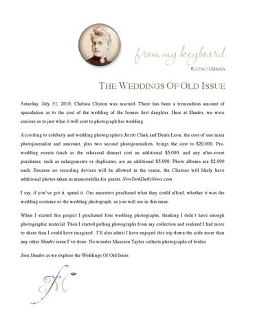 THE WEDDINGS OF OLD ISSUE Saturday, July 31, 2010, Chelsea Clinton was married. There has been a tremendous amount of speculation as to the cost of the wedding of the former first daughter. Here at Shades, we were curious as to just what it will cost to photograph her wedding. According to celebrity and wedding photographers Jerritt Clark and Denis Leon, the cost of one main photojournalist and assistant, plus two second photojournalists, brings the cost to $20,000. Prewedding events (such as the rehearsal dinner) cost an additional $5,000, and any after-event purchases, such as enlargements or duplicates, are an additional $5,000. Photo albums are $2,000 each. Because no recording devices will be allowed in the venue, the Clintons will likely have additional photos taken as memorabilia for guests. NewYorkDailyNews.com I say, if you’ve got it, spend it. Our ancestors purchased what they could afford, whether it was the wedding costume or the wedding photograph, as you will see in this issue. When I started this project I purchased four wedding photographs, thinking I didn’t have enough photographic material. Then I started pulling photographs from my collection and realized I had more to share than I could have imagined. I’ll also admit I have enjoyed this trip down the aisle more than any other Shades issue I’ve done. No wonder Maureen Taylor collects photographs of brides. Join Shades as we explore the Weddings Of Old Issue.