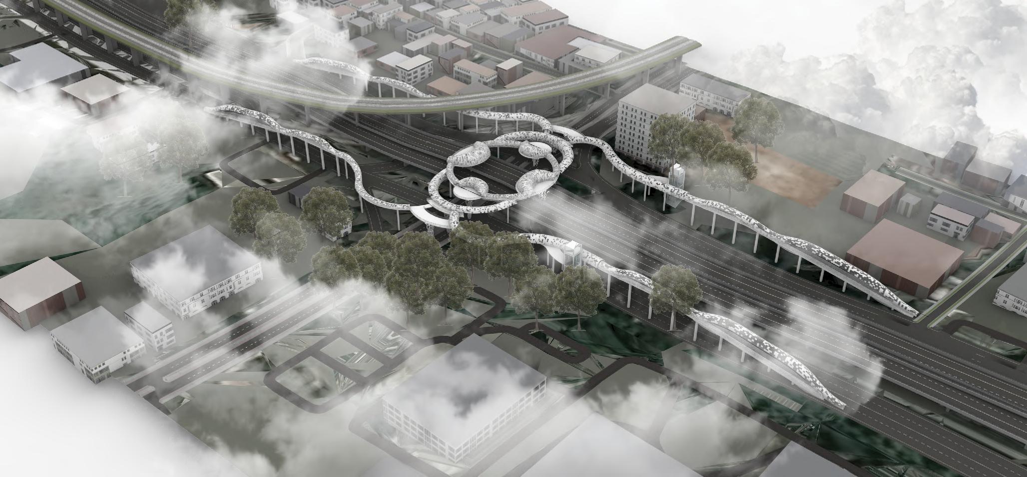 Roots symbolize diversity and difference. In the design, roots depicted as a vertical circulation of pedestrian bridges from various roads.