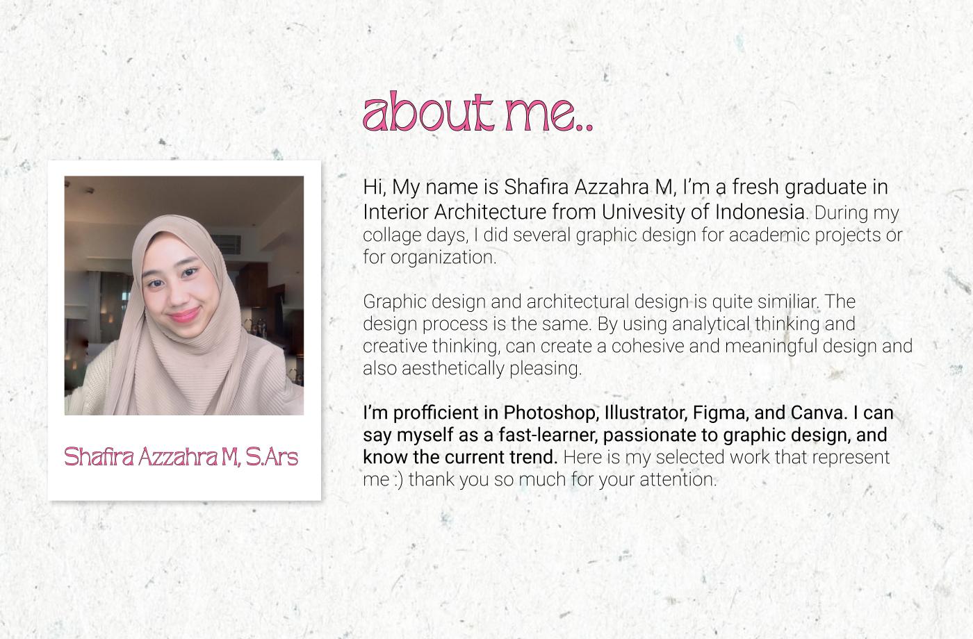 Hello my name is Shafira Azzahra and freshgraduate from Interior Architecture University of Indonesia. During my collage days ,I used lots of design softwares such as Photoshop, Illustrator, and Sketchup. I'm very passionate about graphic design, creative marketing, and content planning. Here is some of my design and illustration and please take some time to look and read. Thank you so much for your time.