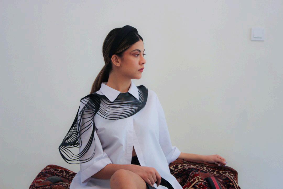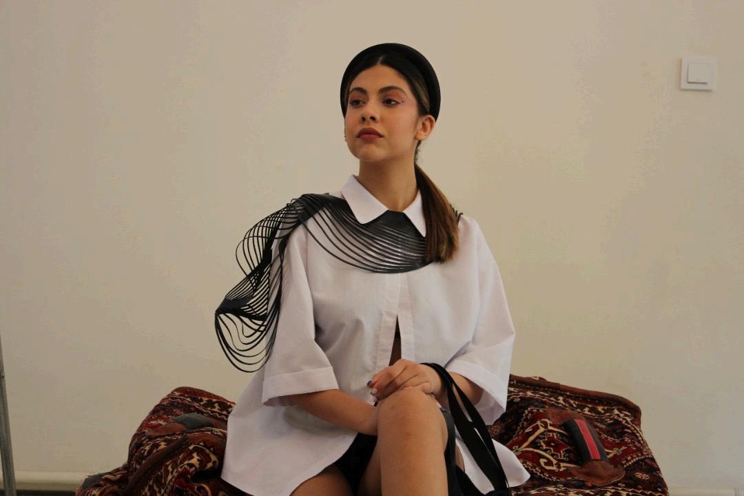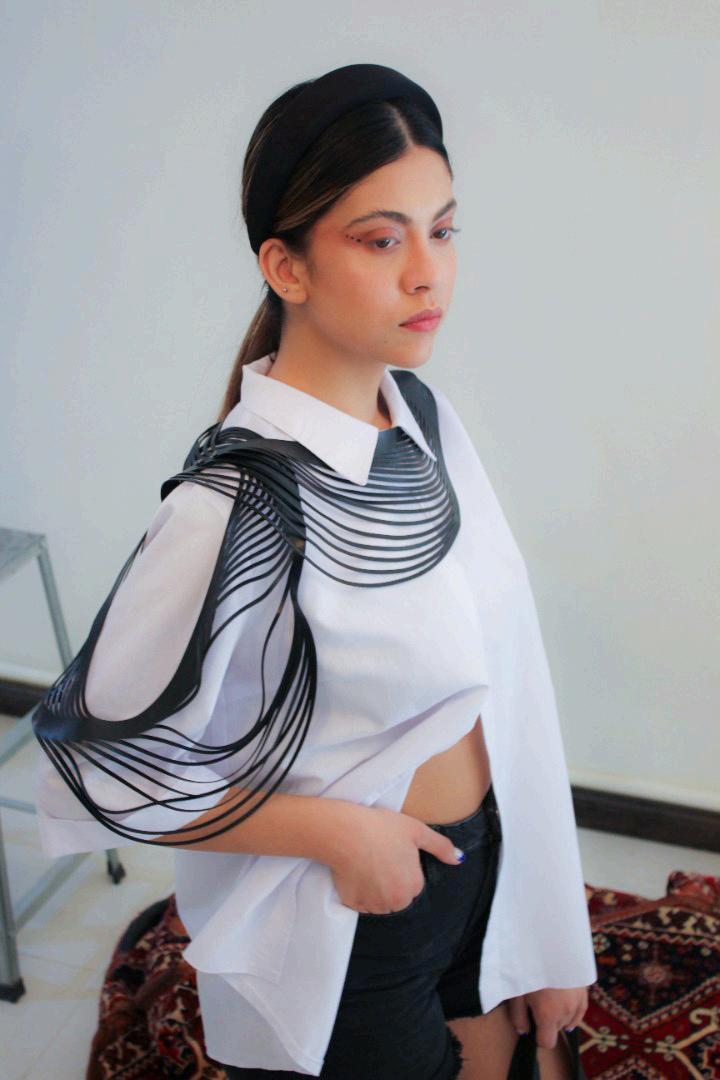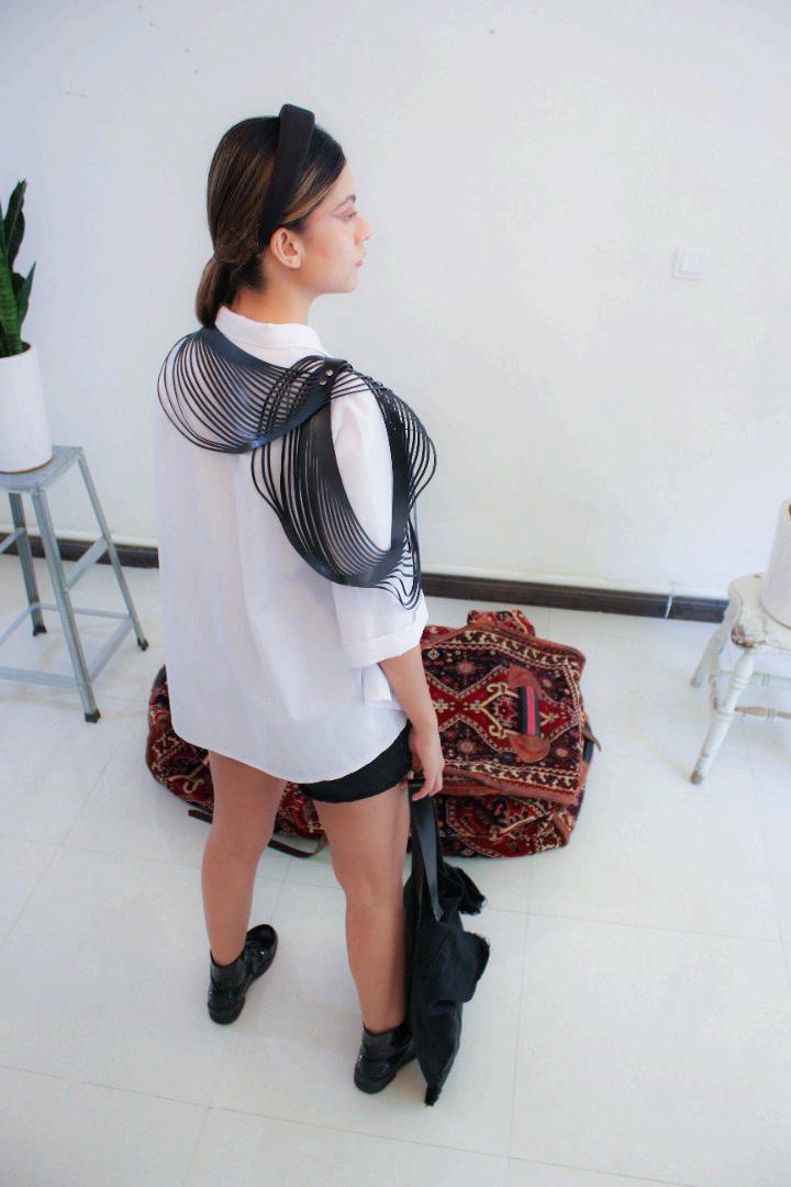 We inspired by MARINE SERRE’s clothing collections creativity and metaverse concept and its importance in our daily life and we used trendy material and shape for this accessory we made. generally metaverse can defined by curved and bent shapes into the nature and it is a floating and light object in the air . So we produced an fashion accessory made of artificial leather in a way that covers the shoulder and hand to show the floating and lightness of the concept and also seems like twisted wires and frequencies in this world.