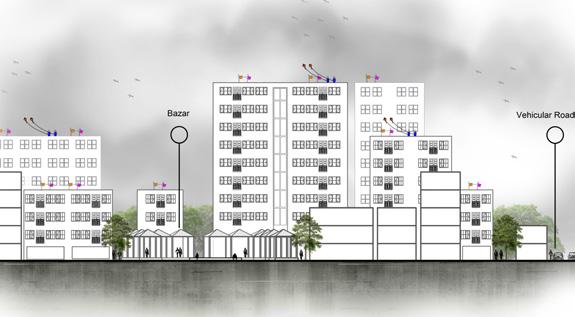 3. The design is creative and valuing the culture by the shape (monolithic structure) which was used in this very Bengal region once and this shape has been creatively improvised by the bamboo structure which help to lessen the dead load so that the whole platform can float during the flood.
