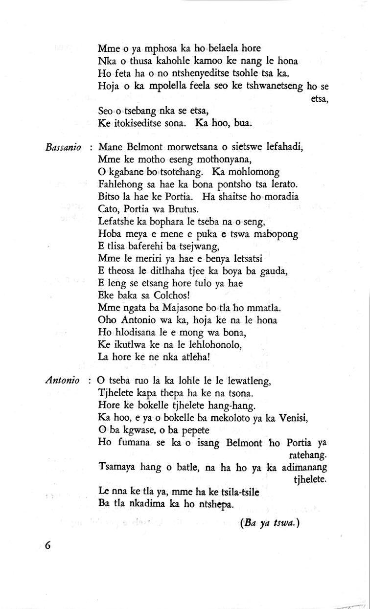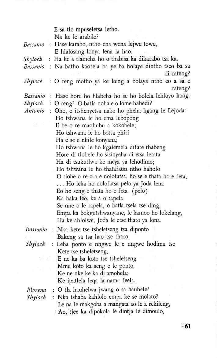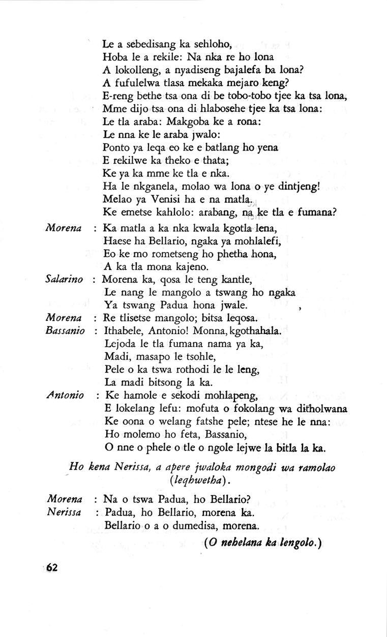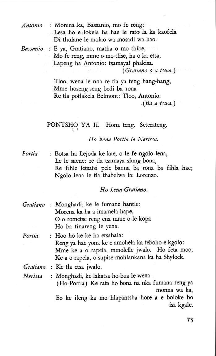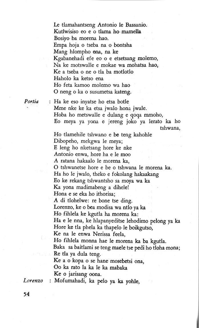 "Feela ho arohana ha reng ena le monwana ona Ke ho arohana ha bophelo le nna, Jwale o ka bua ka sebete wa re Bassanio o shwele."