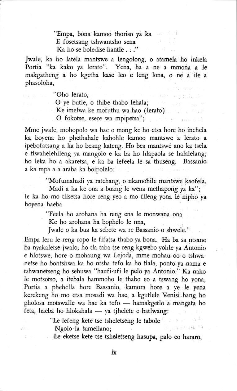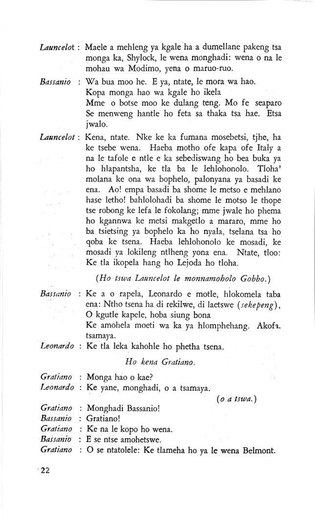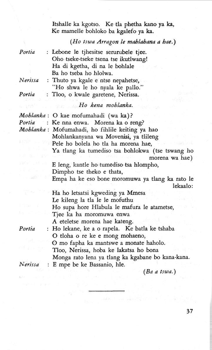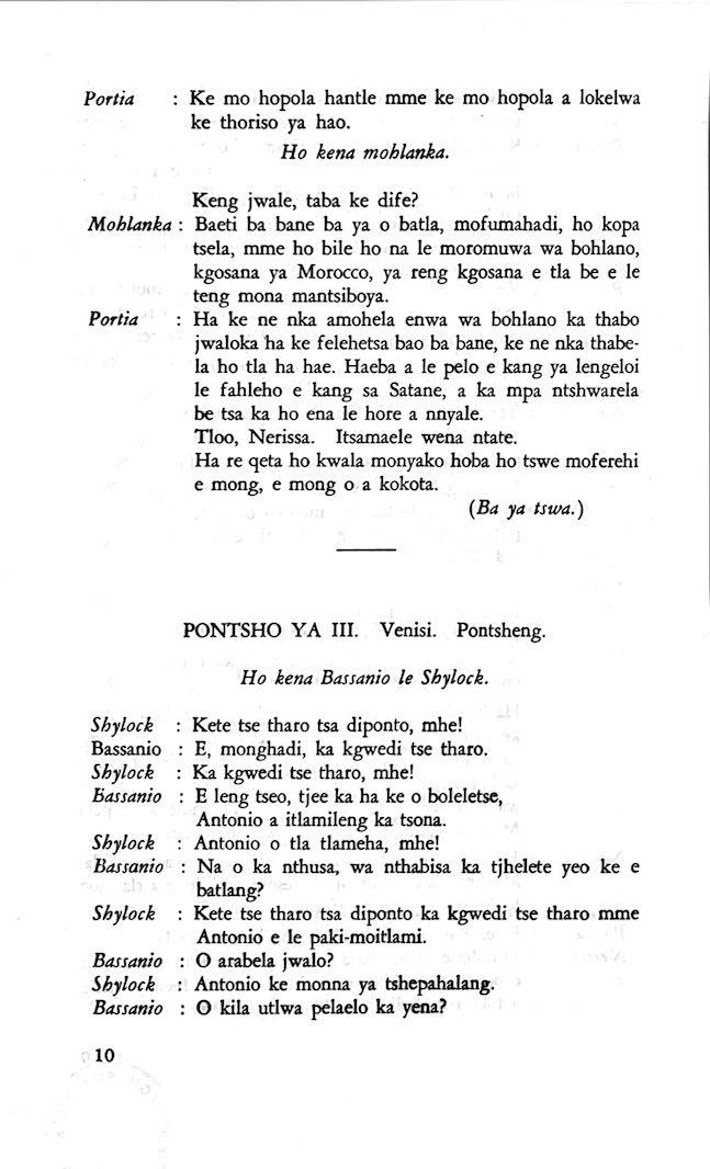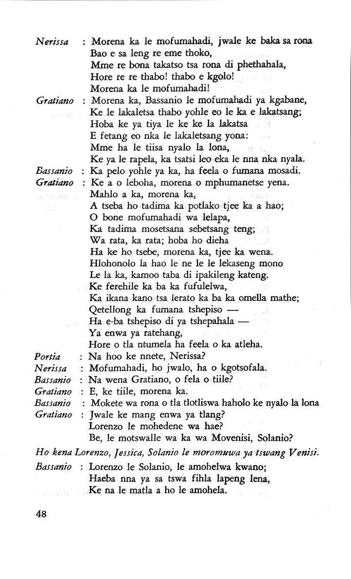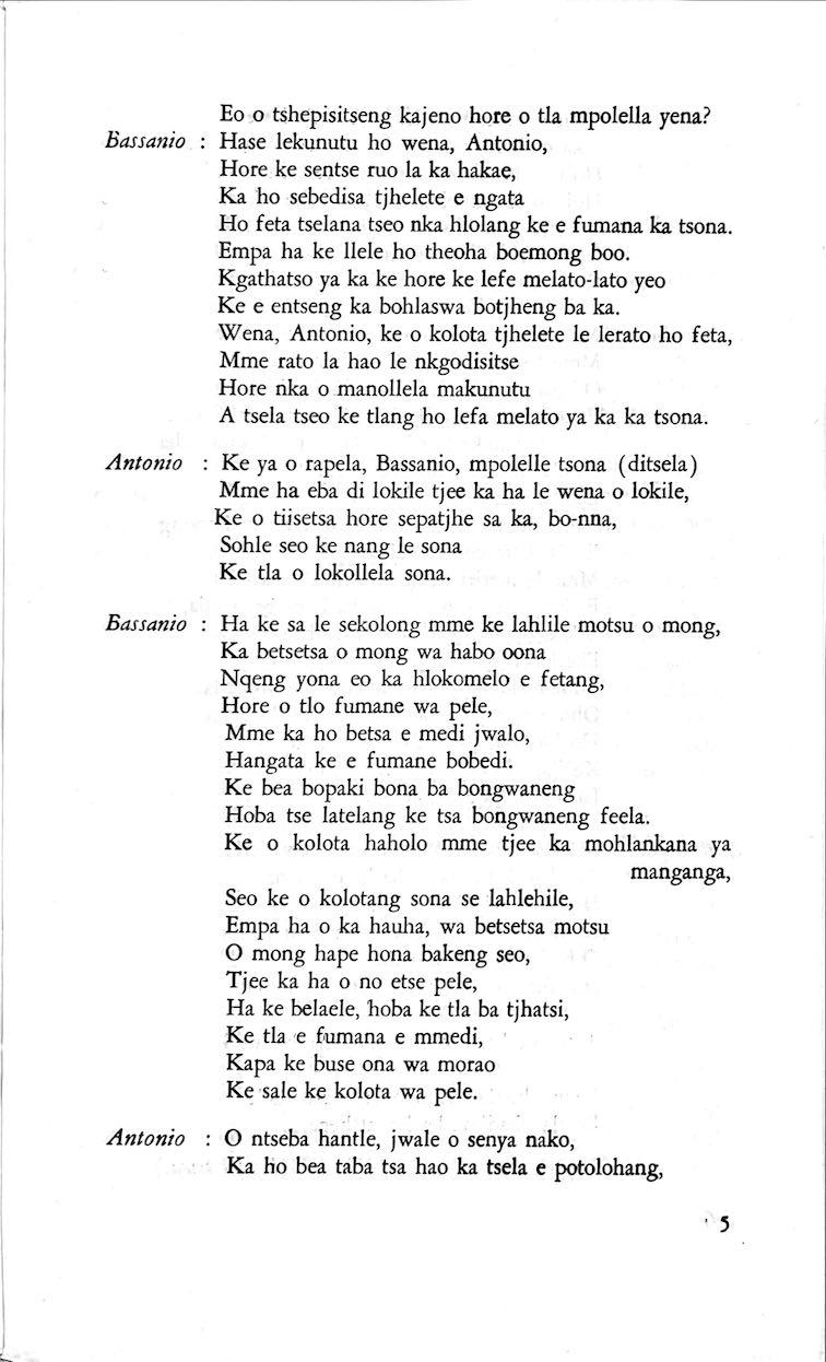 "Feela ho arohana ha reng ena le monwana ona Ke ho arohana ha bophelo le nna, Jwale o ka bua ka sebete wa re Bassanio o shwele."