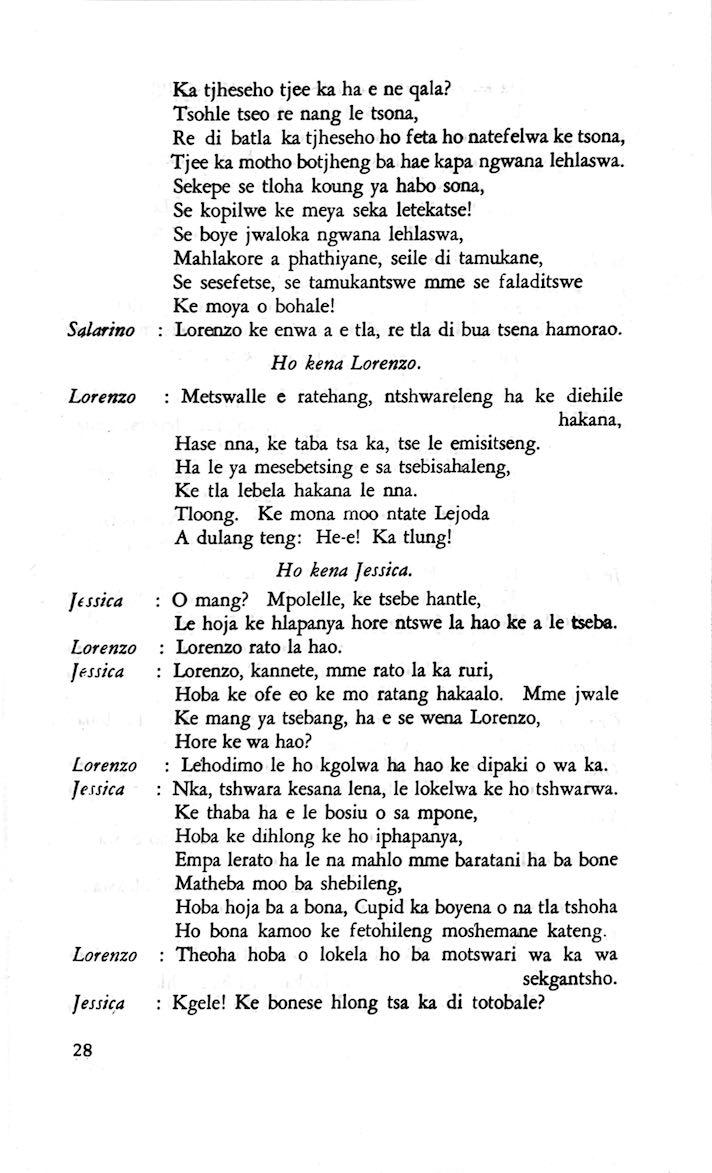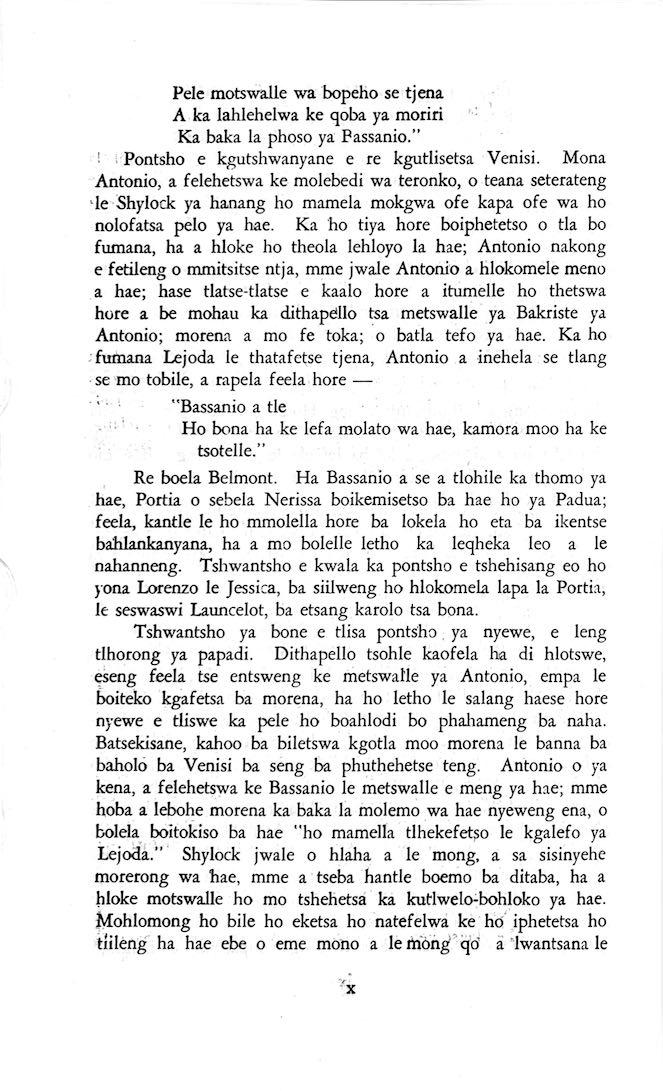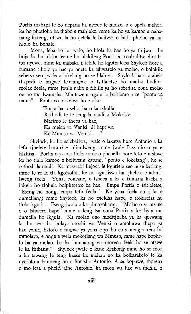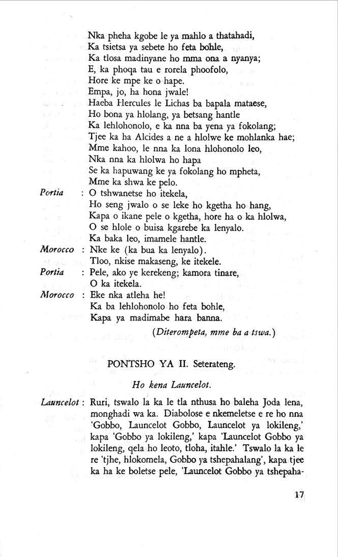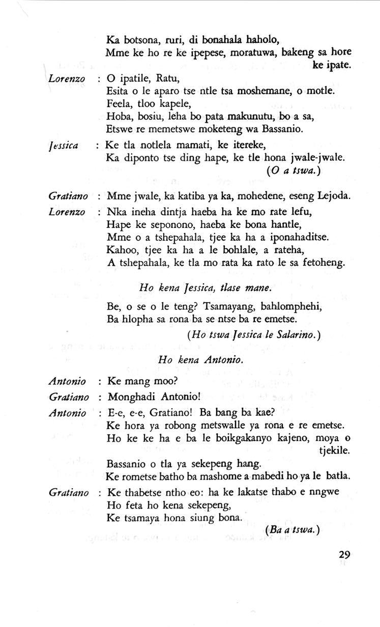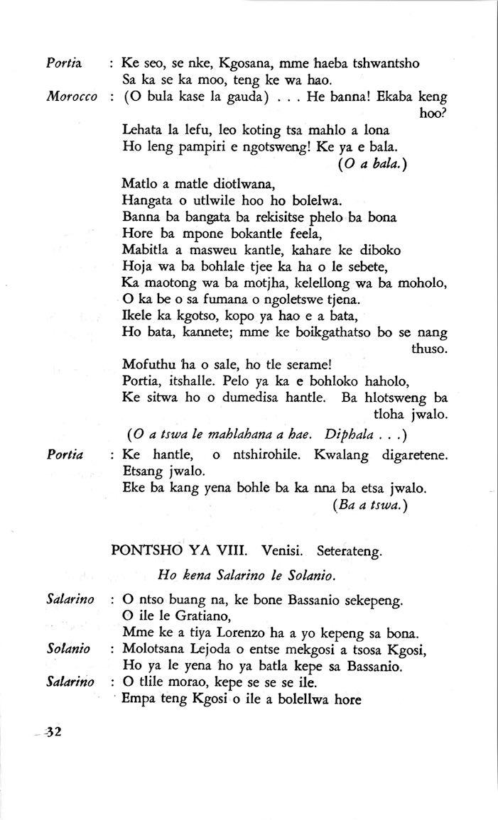 "Feela ho arohana ha reng ena le monwana ona Ke ho arohana ha bophelo le nna, Jwale o ka bua ka sebete wa re Bassanio o shwele."