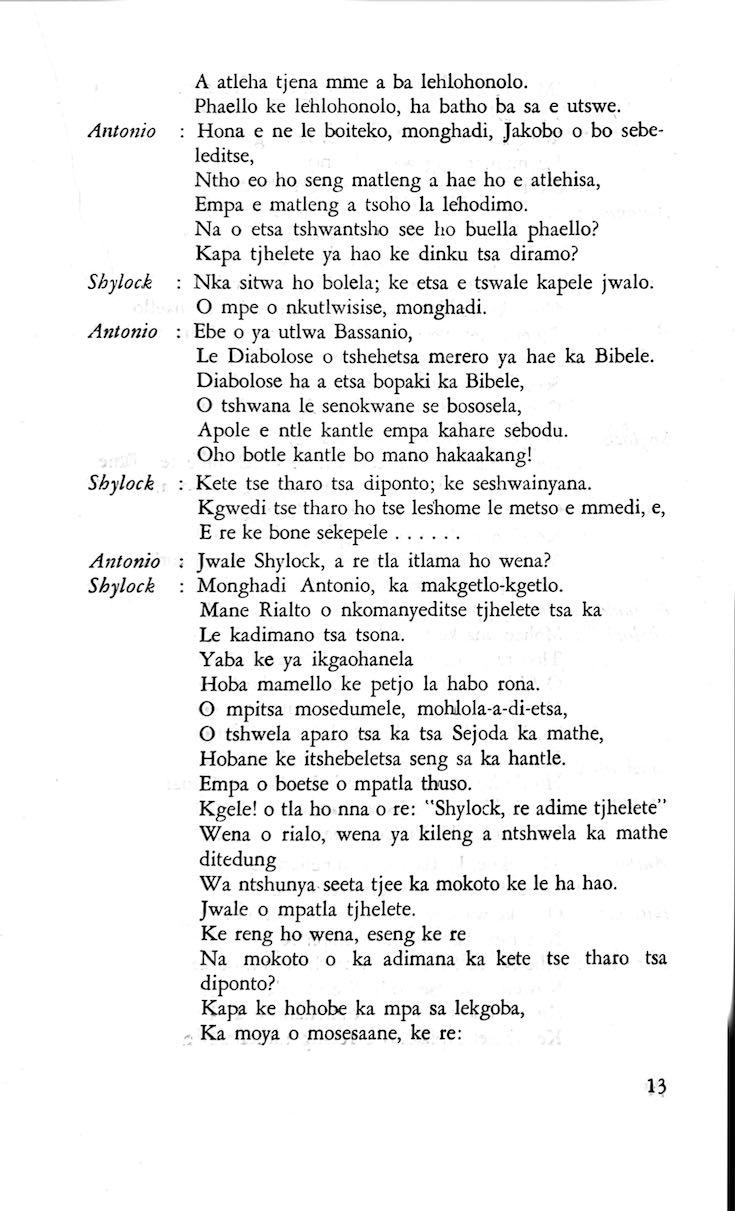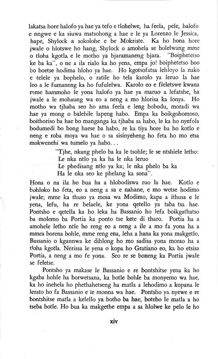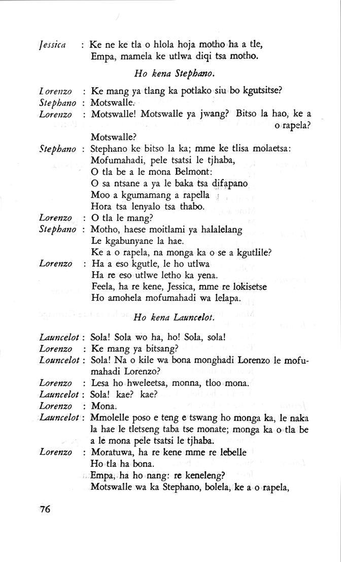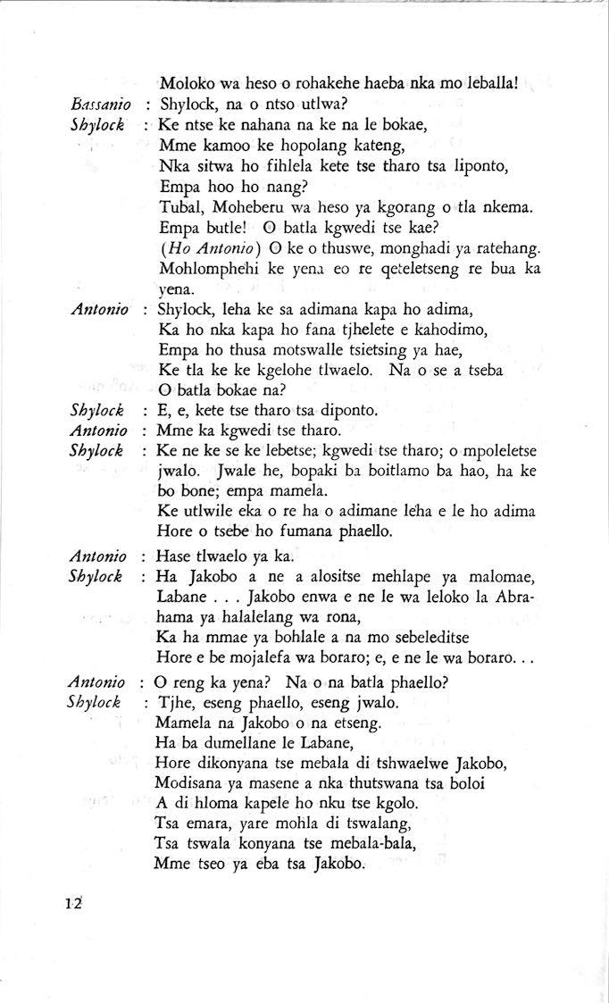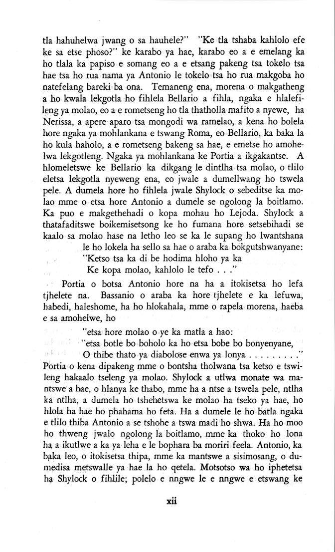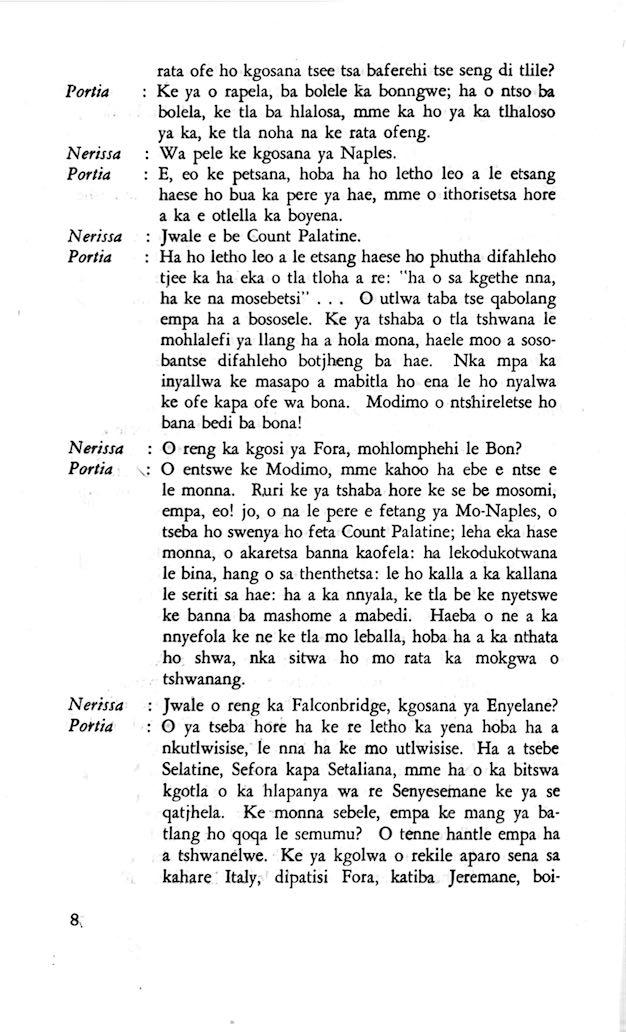 "Feela ho arohana ha reng ena le monwana ona Ke ho arohana ha bophelo le nna, Jwale o ka bua ka sebete wa re Bassanio o shwele."