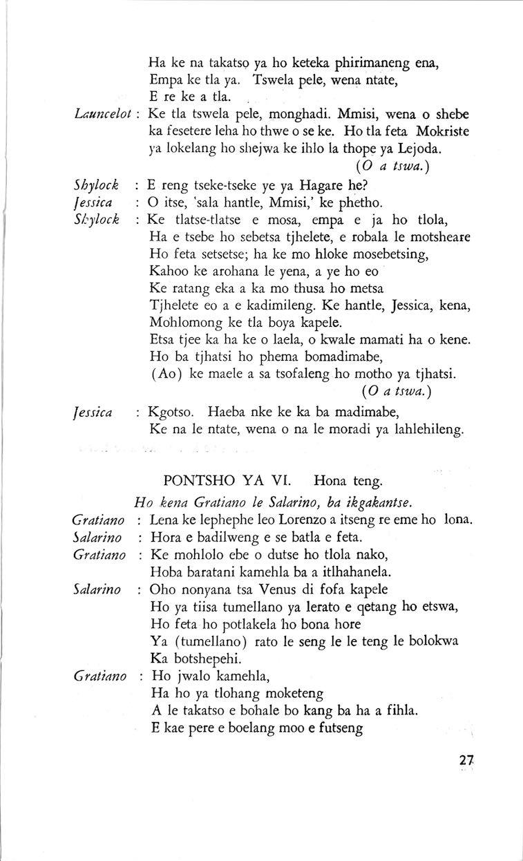 kopano ya Bakreste bohle ba Venisi. hloilweng ke bohle haese feela ba nyedisang; yena e le ya blapaolwang, haholo-holo ke Antonio; ntata ya utsweditsweng moradi ke e mong wa badumedi ba Antonio; lekgonatha leo ka bona bokgonatha a senyeditsweng leruo la hae leo a le fumaneng ka thata: ka hore ena o lokela ho nontsha lehloyo la hae la kgale hodima Bakreste bohle ka ho iphetetsa hodima e mong le e mong wa bona eo hohle a hlomphuwang a bokgabane ba botho ba hae, a ratuwang hohle ka baka la molemo wa pelo ya hae e totobetseng. Le hoja ho se pelaelo ho utlwa a entswe hampe ha Shylock ho hodisitswe, ke hwa nnete. bo lokelang ba hae ho ba wa tjhaba se seholo bo nnile ba hatakelwa kahohle, mme o ne a ka nna ipelaetsa ka tshwanelo ha manganga a hae a se nang tshabo a dumela, hore seo a neng a le sona ke seo boholo ba sona dira tsa hae di mo entseng sona. Mme ha phoso tse entsweng hodima tjhaba sa habo di eketswa hodima tse entsweng hodima hae, le teng o ne a ka nna ipelaetsa ka tshwanelo tjee ka ha a etswa karolong e nngwe ya papadi, hore mehlala yohle eo a bileng le yona ya mamello le tshwarelo, Bakriste ha ba fetane hakae le tihaba sa habo. boo, ha morena a leka la ho qetela ho ama kgwele ya mohau pelong ya hae, ha re ya itokisetsa feela ho fumana hore ha ho karabɔ, empa ha re makalle puo e nyefolang e somang eo ka yona a ikemelang ka ho tshwara Antonio tjee ka phoofolo e senyang co a neng a lokela ho e bolaya ka tjhefo. Hacba a ikgethela ho tela kete tse tharo tsa diponto hore a fumane "boima ba nama e nkgang'", hoo ho na le taba le motho ofe? bang ba hloile kolobe e ahlamileng, ha ba bang ba hlanya ha ba bona katse, yena a seke a hloya Antoino hobaneng? thatong ya motho feela, mme thato ya hae ke ho fumana ponto ya nama ya Antonio. supa hore ho bea mabaka ha hae hase karabo "e hlalosang lonyá lena la hao'", Shylock o itokiseditse ho araba karabo ka karabo, mme Antonio, ho tseba kamoo ho sa thuseng kateng ho "pheisana kgang le Lejoda", o senya kgang ka ho kopa hore nyewe e diwe.