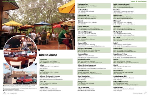 1244 Canterbury Road, Shakopee (952) 277-0282 • www.arizonas.com 16180 Flying Cloud Drive, Eden Prairie (952) 934-5299 • www.lionstap.com 1260 4th Avenue East, Shakopee (952) 445-8660 • www.marcos.com 3990 12th Avenue East, Shakopee (952) 445-8050 • www.mcdonalds.com 4058 12th Avenue East, Shakopee (952) 402-9100 • www.mcdonalds.com 1561 First Avenue East, Shakopee (952) 233-7306 • www.mrpigstuff.com 20201 Johnson Memorial Drive, Jordan (952) 492-6700 230 South Lewis Street, Shakopee (952) 445-9218 • www.pablosmexican.com 8062 Old Carriage Court, Shakopee (952) 445-8705 • www.panerabread.com 1106 Vierling Drive East, Shakopee (952) 445-8118 • www.papamurphys.com 1205 East 1st Avenue, Shakopee (952) 445-6475 • www.perkinsrestaurants.com 1244 Canterbury Road, Shakopee (952) 233-1801 584 South Marschall Road, Shakopee (952) 496-0000 4057 Dean Lakes Boulevard, Shakopee (952) 496-1627 21775 Ridges Drive, Jordan (952) 492-2644 • www.ridgesatsandcreek.com 4135 Dean Lakes Boulevard, Shakopee (952) 403-7893 2014 | Visit Shakopee