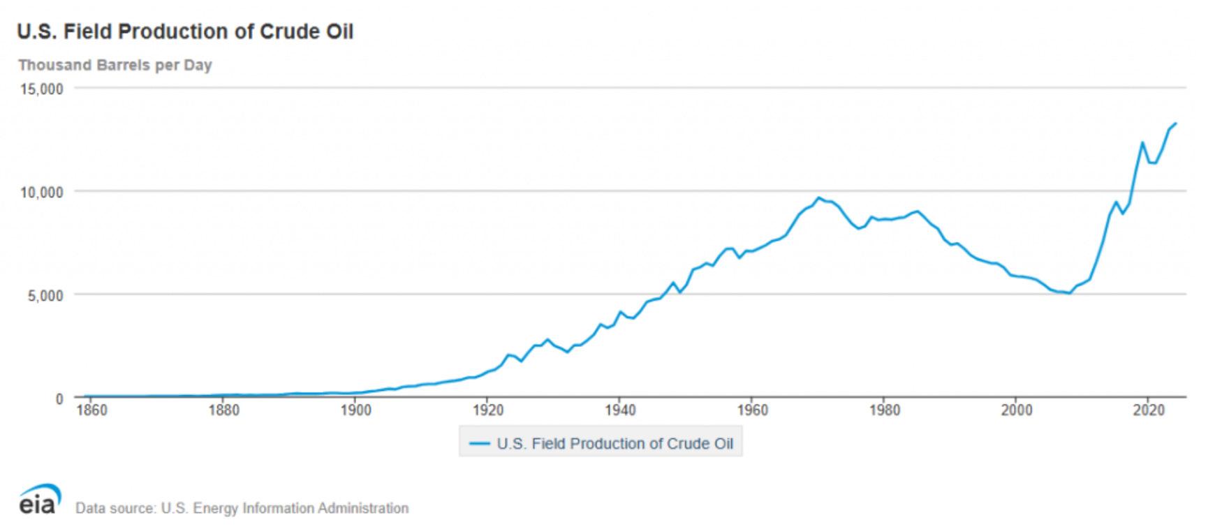 According to data from the Energy Information Administration, U.S. oil production averaged 13.2 million barrels per day in 2024, up from 12.7 million in 2023 and 12.5 million in 2022.