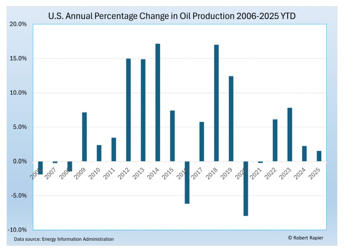 The result is a measured pace of growth that looks nothing like the wild expansion of 2010–2019, when U.S. production more than doubled in less than a decade.