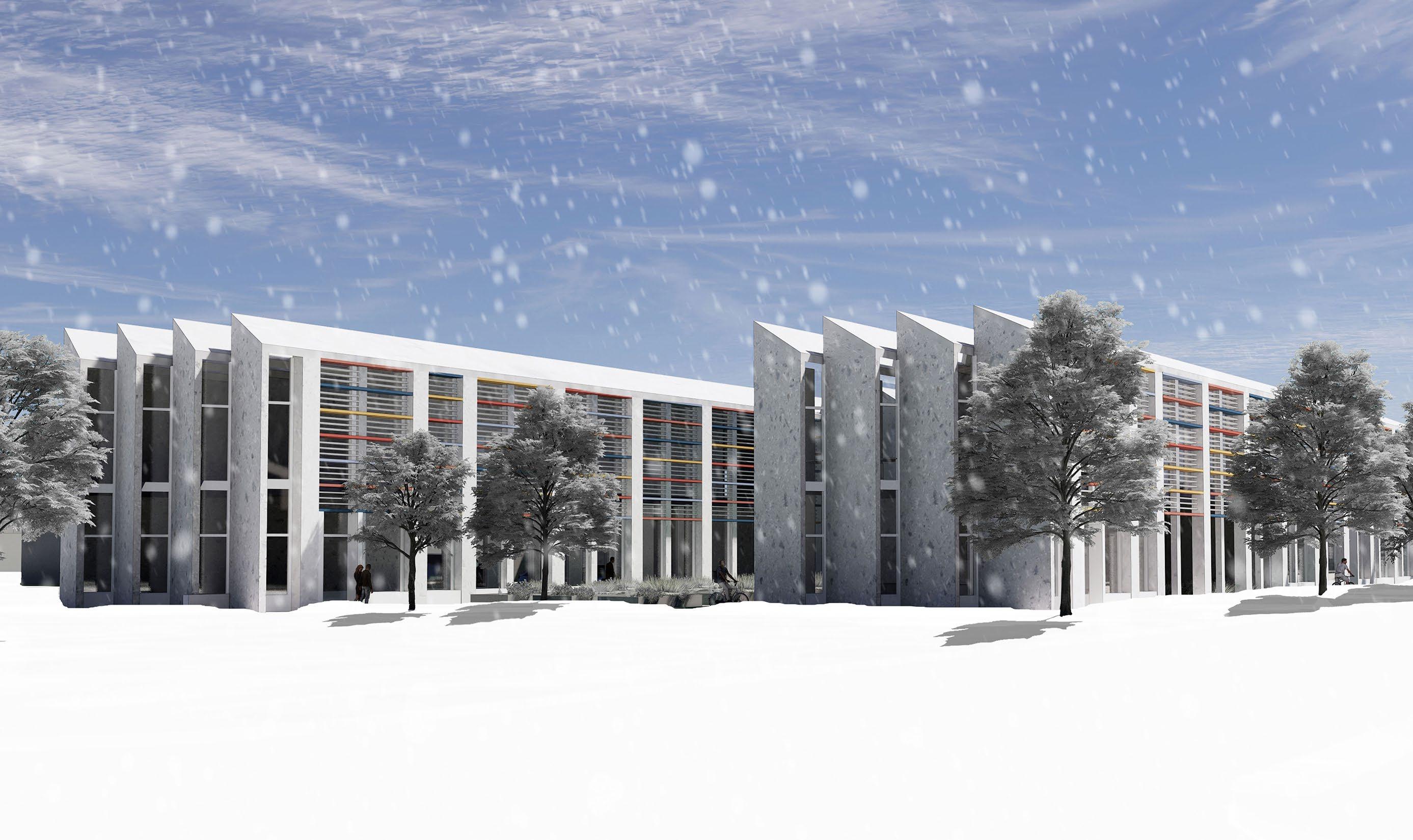 This Mixed-Use Residential building has two apartment types (2-person apartment and 3-person apartment) while incorporating a food production element into the ground level of design. The design of this Mixed-Use Residential building is utilizing brick as the structure and veneer material while incorporating vertical farming as means for food production.