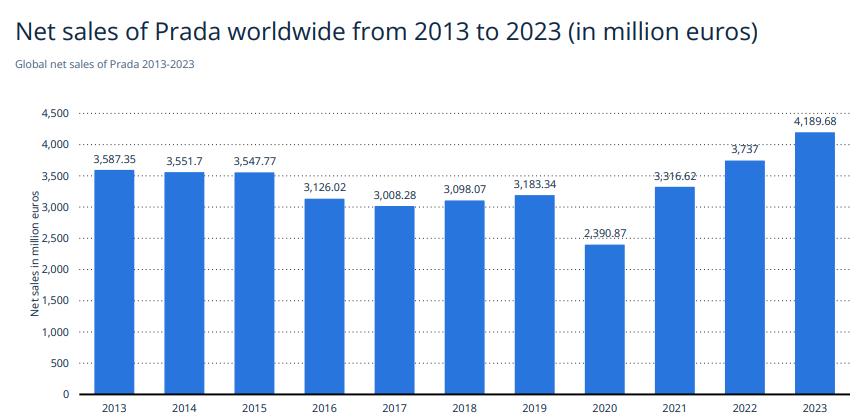 Prada is renowned for its use of premium materials (Prada Group, 2024b) specifically the use of Italian leather, their leather goods such as handbags, wallets, purses etc account for almost 50% of their revenue at 45.6% (Statista, 2023). Prada’s global net sales in 2023 equated to 4,189.68 million euros worldwide and their revenue in 2023 amounted to 3,912,309 million Euros (Prada Group, 2024b). Furthermore, across all brands under the Prada Group leather goods brought in the most sales with 1,910,061 million euros. As for their drastic decline in 2020 as shown in figure 1.3, this drop in revenue is due to the impact of Covid-19, however since then the brand has been making a steady year-on-year growth in terms of sales (Statista, 2023).