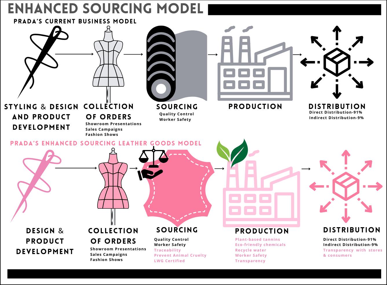 Prada uses Saffiano grain type of Italian leather (Todd, 2020) and they currently supply custom-made materials to their factories (Prada Group, 2023b) to craft this leather for their bags ensuring that they have right quality for their leather goods. In addition to that, the quality of their leather bags justifies Prada’s pricing, however some bags are overpriced. The company’s current business model collects orders of their designs prior to sourcing to retain mix flexibility in production costs (Prada Group, 2023a), therefore they can produce the right quantity and know the right timing to stock the products.