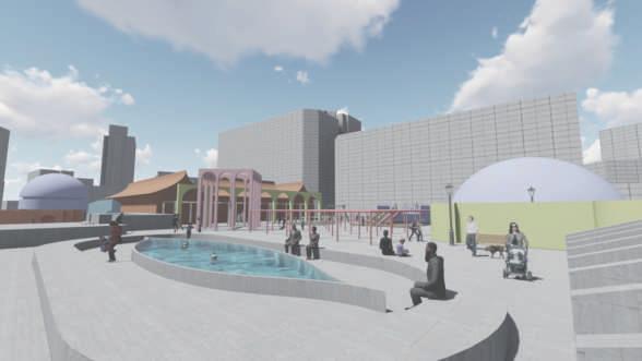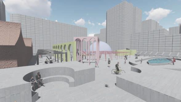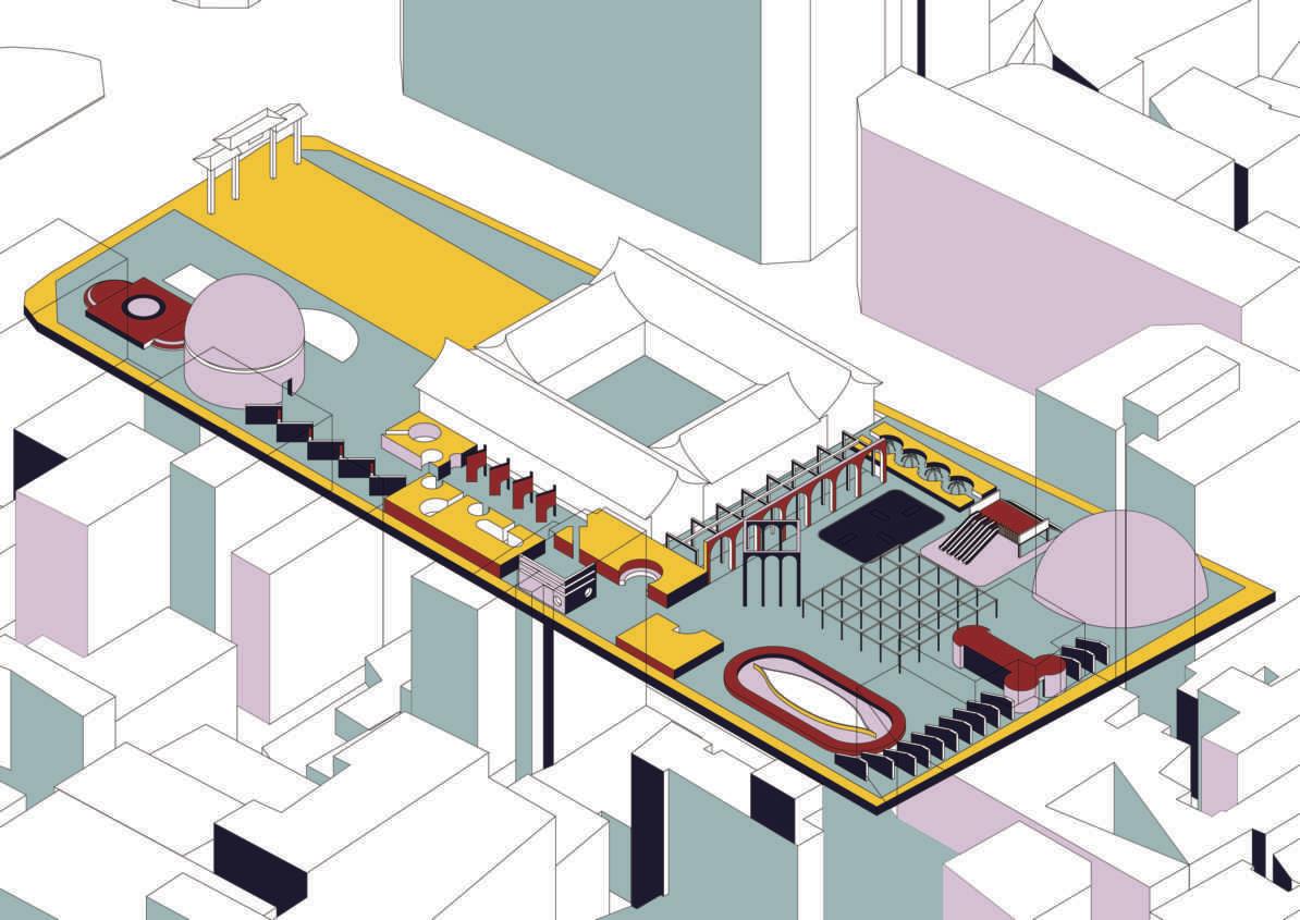 In order to preserve the memory of the city, we use the surrounding texture of the base as the starting point of the design. We divided the base area into eight areas by connecting urban routes. Considering the continuity of urban memory, we built restaurants, bookstores, bars, museums, and workshops into the base. These building functions reflect the proportion of building functions in Harbin city. Finally, we took into account the factors of the cold climate and created squares with different elevations by means of raising and lowering to achieve the effect of snow drainage and bring interesting imaginative usage methods to the base.