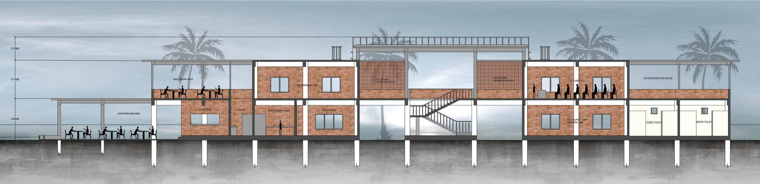 The vision for the project was to establish a skill development and exhibition centre within the Marian campus. It would provide a platform for conducting expos, prototype and creative exhibitions, workshops, Product launches and other learning events. The centre is expected to attract researchers, mentors, students and investors from all over the state. The brief of the project was to develop a centre with classrooms, workshops, exhibition spaces and a multipurpose hall. The structure must have a morphology that is similar to other buildings in the campus.