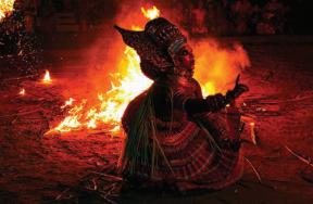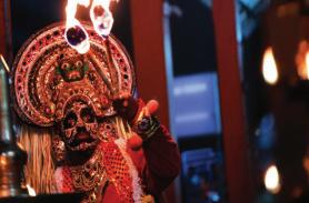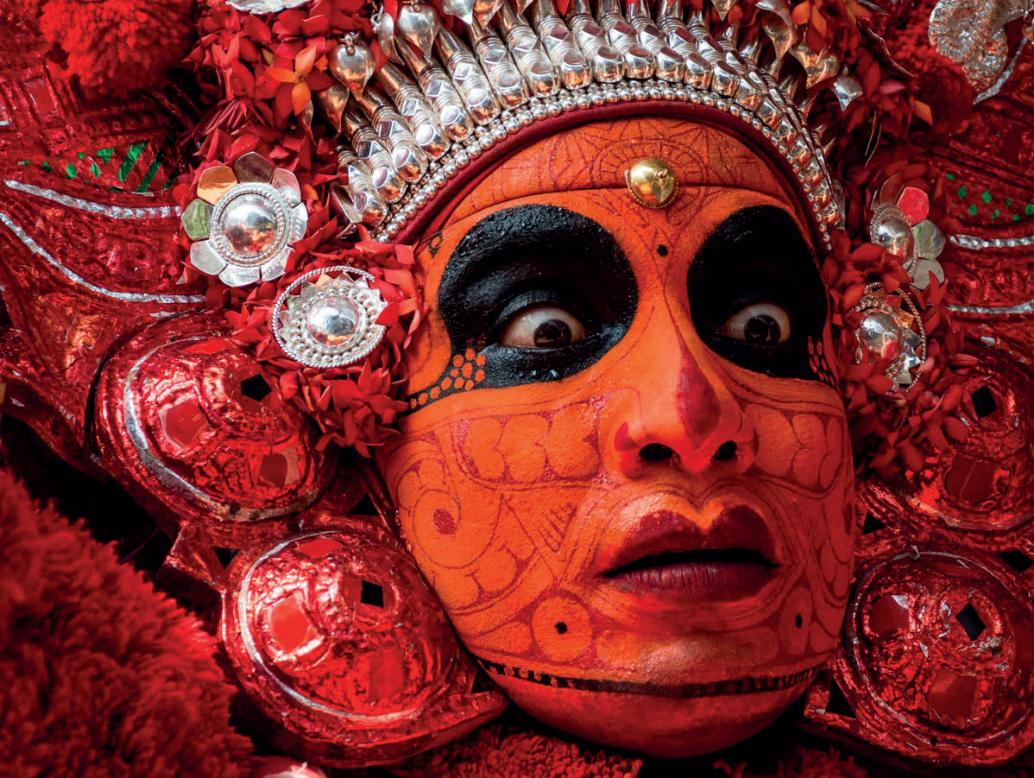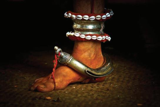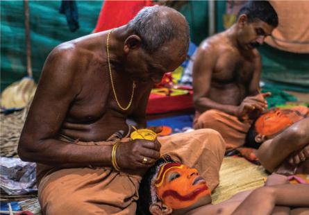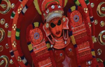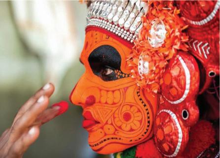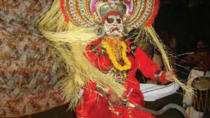 In ancient times people believed that performing various pujas in village temples and other public places would solve all their problems. The 'lower' castes also took advantage of the special status accorded to them by the rituals. With elaborate designs on the face, glamorous ornaments and huge hats, the artists tried to convince everyone, including the upper caste Brahmins, to accept their divinity.