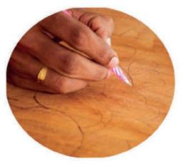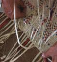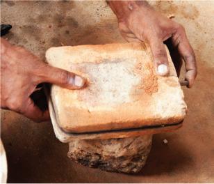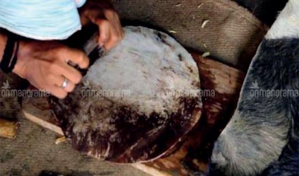 An even more difficult task demanding precision is creating the black circular ring that you spot on the centre of the mridangam sides and the tabla. The process of making them is called 'mashiyidal'.The black powder is obtained from a stone called puranakallu, rich in iron. These stones are mostly taken from temple ponds. The powder is then mixed with boiled rice, kneaded well to a paste and is smeared on the mridan gam head the sides of the mridangam. The strings are pulled and fastened tightly to set tension at all spots to create the perfect shruthi or the tone at all points