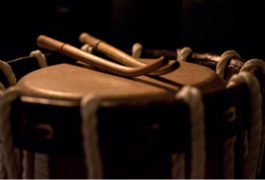 The dancer and the drummers recite a traditional song, which describes myths and legends, of the gods of the sanctuary or of humanity to be appeased. This is in line with the playing of traditional musical instruments
