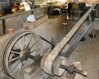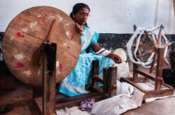 Yarns are wound to the pirns by the charaka equipment for the weaving process.