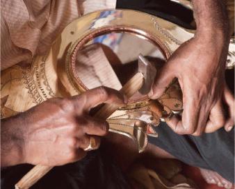 The base drum is made using jackfruit wood or Kanikonna. The dried skin is the cut to length and attached to the ends of the drum, sealed and knotted to perfection using hands. The drums are balanced between the legs, and the outerstraps made of buffalo skin are inserted through small slits round the sides of the mridangam. The strings are pulled and fastened tightly to set tension at all spots to create the perfect shruthi or the tone at all points.