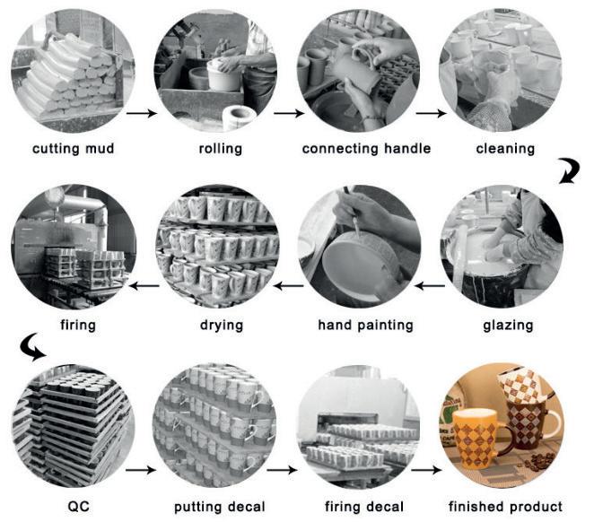 The making process involves different stages such as clay refining, clay mixing, throwing on the wheel, drying and firing.
