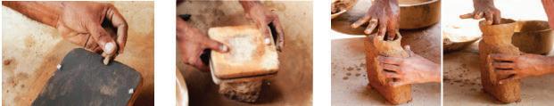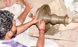 Thedough is made by mixing sand and matti-clay with water. The main instrument used to create the fundamental shapes of the idol is the potter's wheel.