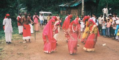 Kambra Nritham is associated with activities in the paddy fields. It belongs in the mountainous region of Wayanad in northern Kerala. the mens in adiyaan tribe dressed in red lined up on the muddy edges of rice fields and began to dance and sing,while women busily planted new rice seedings in the fields
