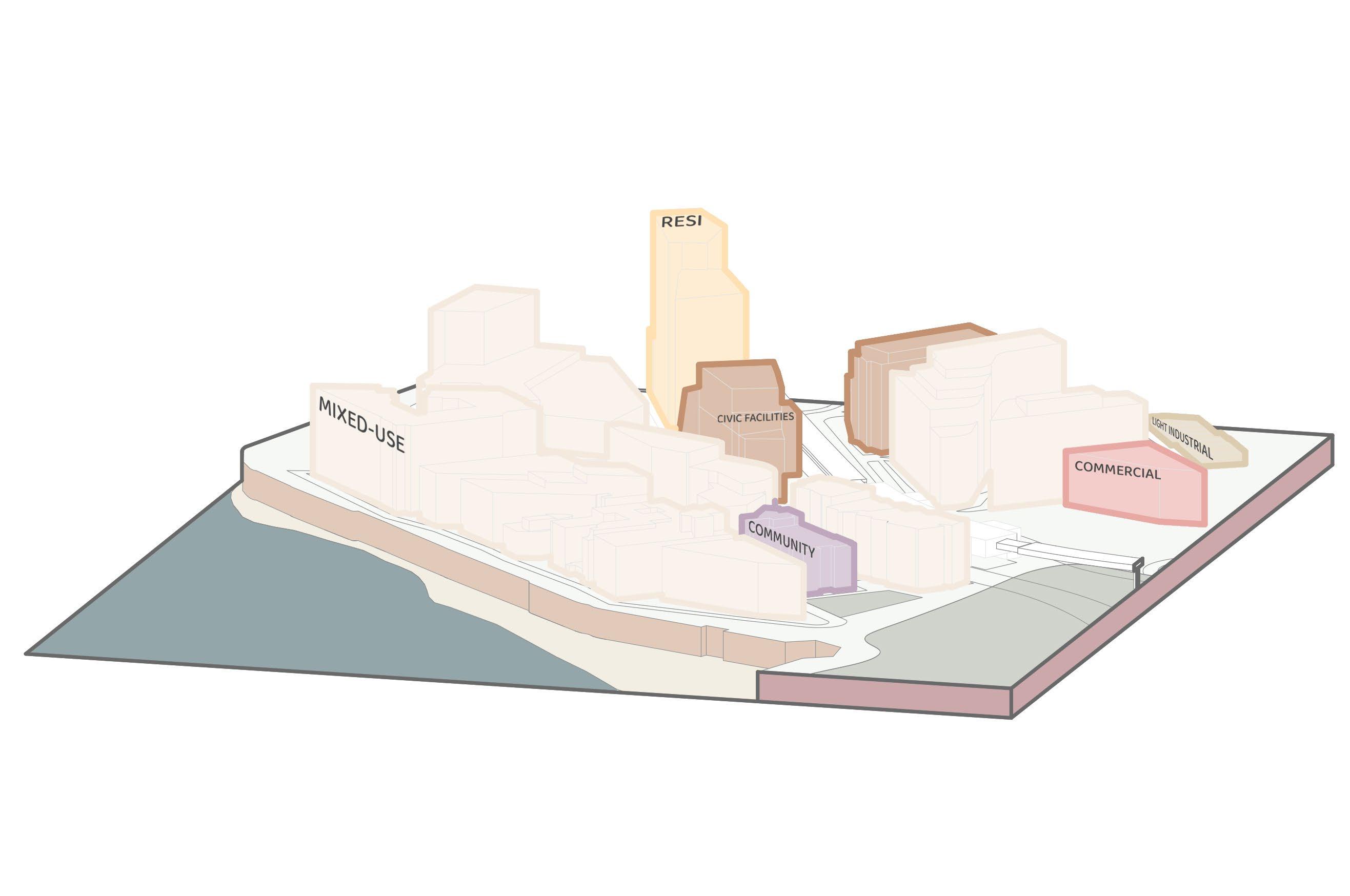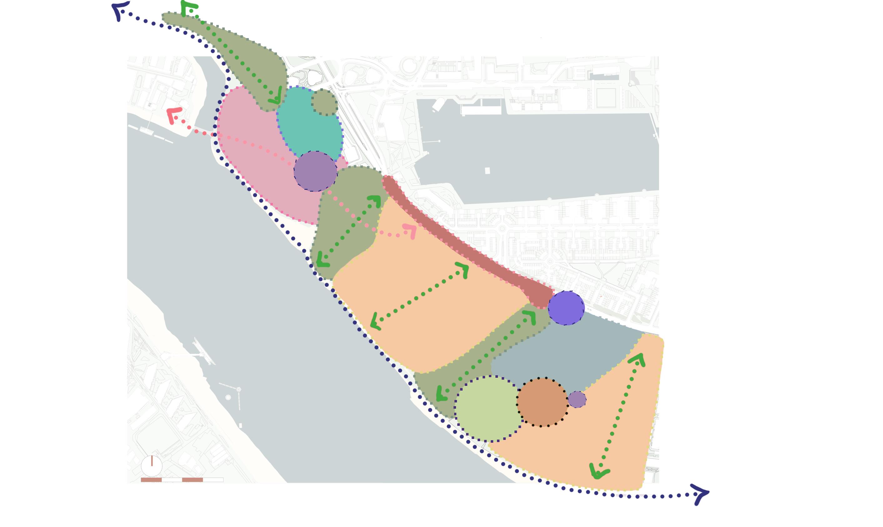 THE REDEVELOPMENT AREA WILL BE SPLIT INTO 5 DISTICTIVE CHARACTER AREAS. THE TATE DISTRICT, LOCATED WITHIN TRADE WHARF, TAKES INSPIRATION FROM THE DESIGN DESRICT WITHIN NORTH GREENWICH ACCROSS THE RIVER FROM THE SITE. THIS ALLOWS A NEW EMPLOYMENT ZONE TO BE CREATED WITHIN AN EXISTING LIGHT INDUSTRIAL AREA. PRIMROSE WHARF WILL BE REACTIVATED TO PROMOTE FURTHER JOB CREATION AND TRADE INDUSTRY, ALONG WITH PRESERVING THE SITES HISTORICAL FACTORS.