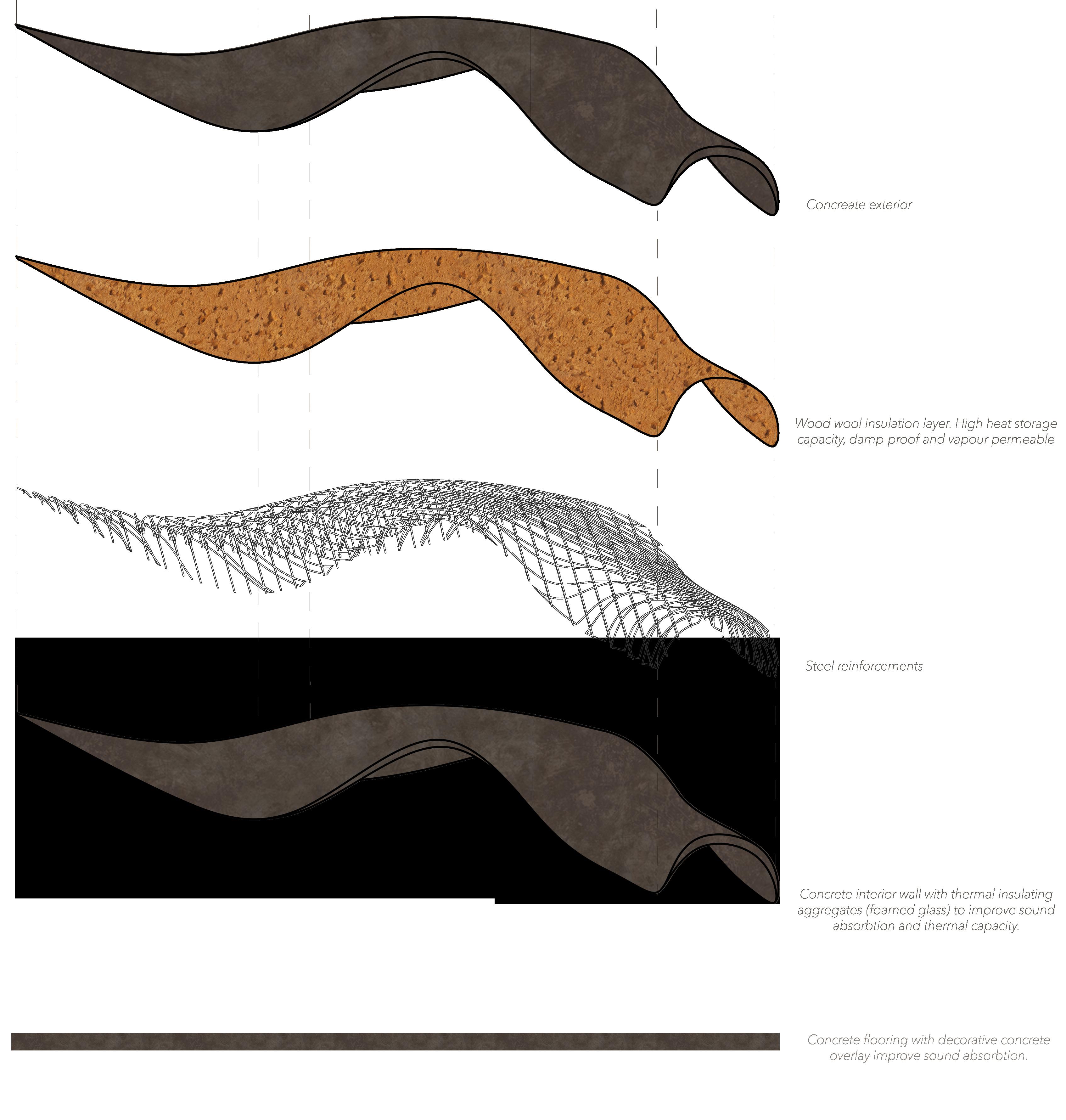 The concrete’s interesting edge, is the use of recycled foamed glass, to provide acoustic insulation. Foamed glass have a plethora of benefits, including it being lightweight in nature. This decreases landfill on dismantle, lowers transport costs and reduced manual handling to name a few. It is also non-toxic, fire resistant and non-water absorbent. The structure is slightly shaded in winter months, but the majority will be able to absorb the suns heat due to the dark fly-ash colour in the concrete mix, or seep through the glass facade. In the summer, it will receive natural cooling via evaporation of the Thames river.