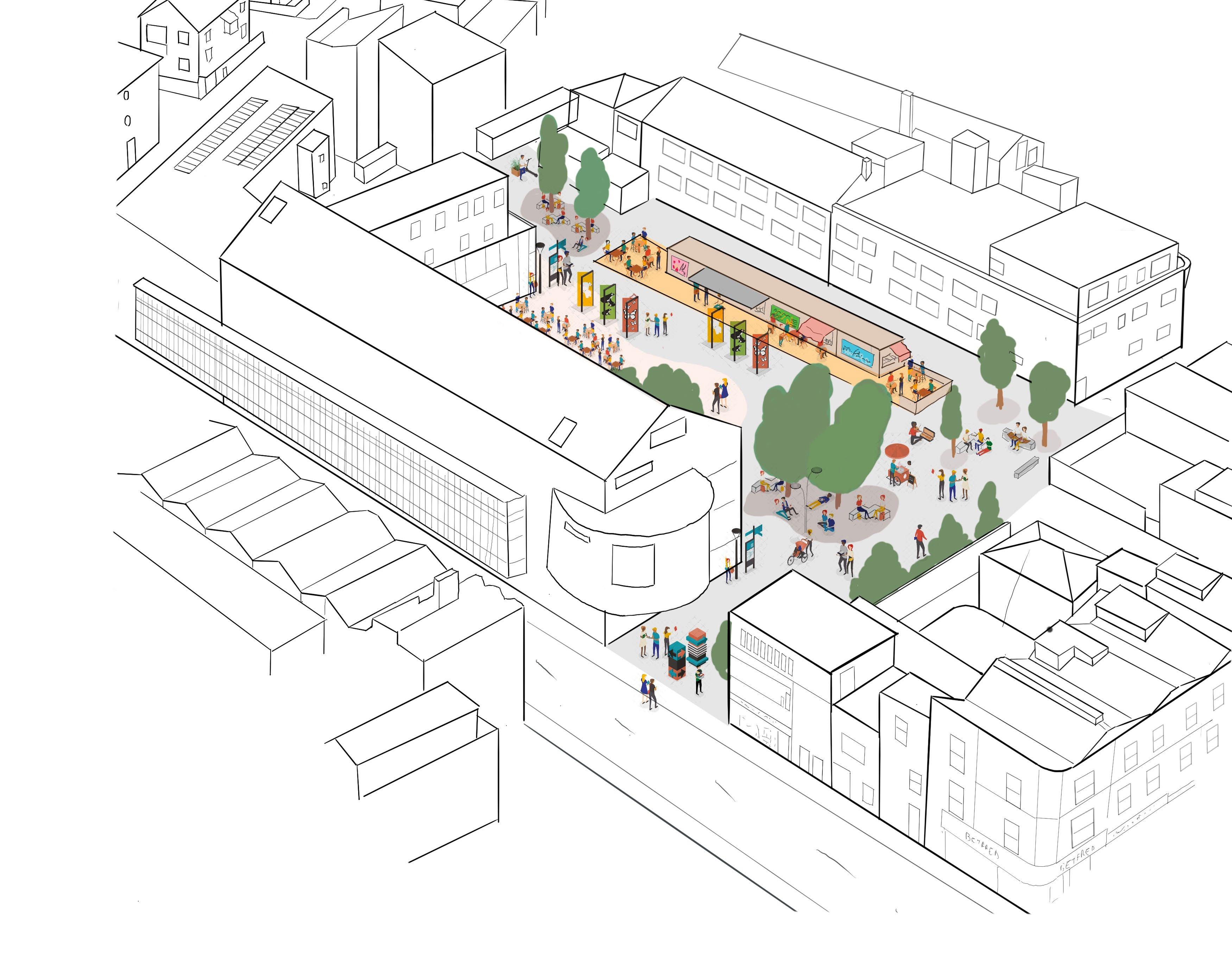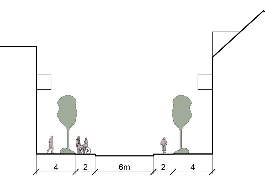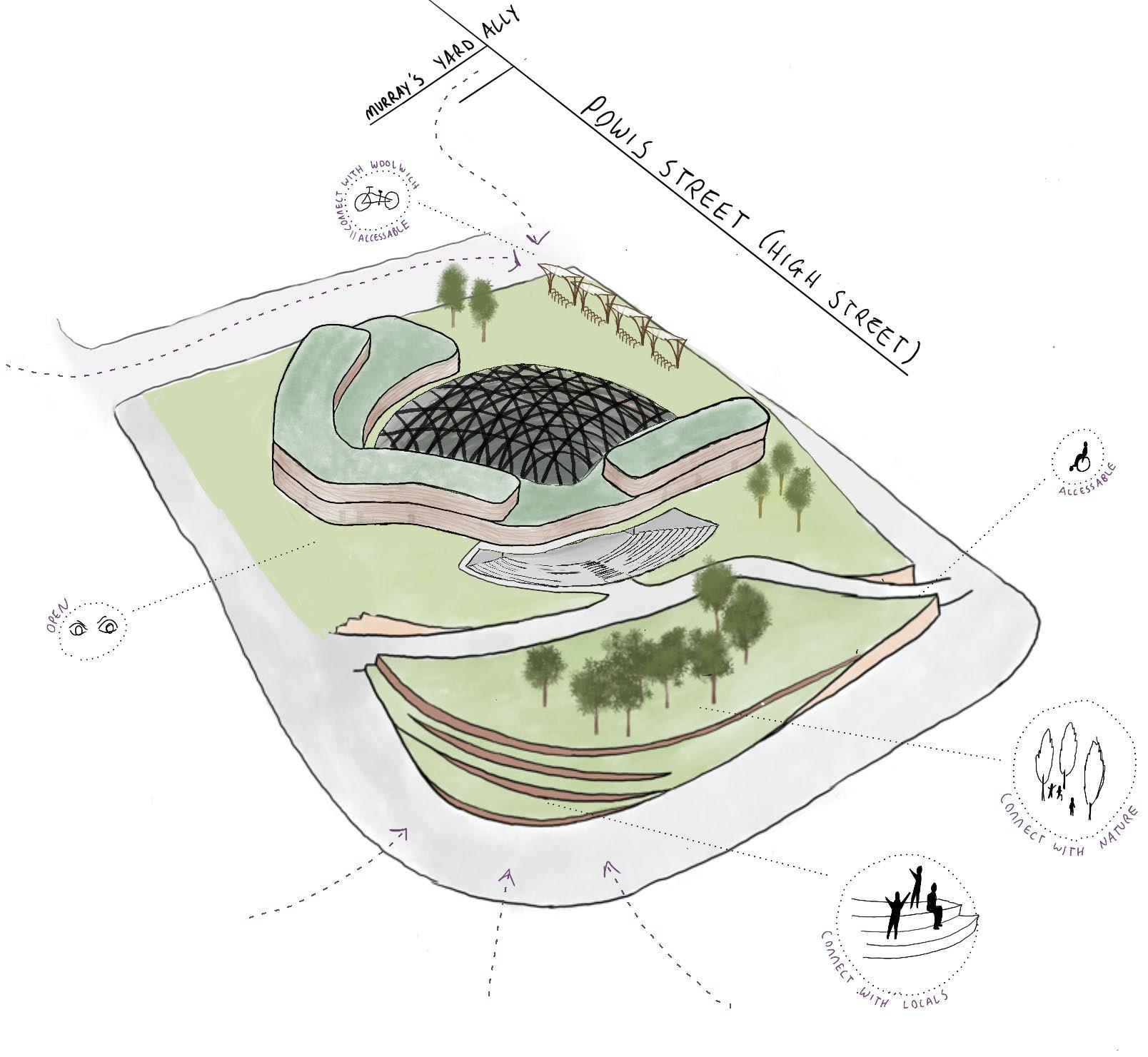 Opening the Murray’s Yard allyway, leading from Powis Street, opens foot/bicycle traffic and links the two sides together, forming a bridge for the community. It goes without saying that all buildings should be accessible to all, landscape too, so the site will be implemented with access ramps from the street on both the east and west.