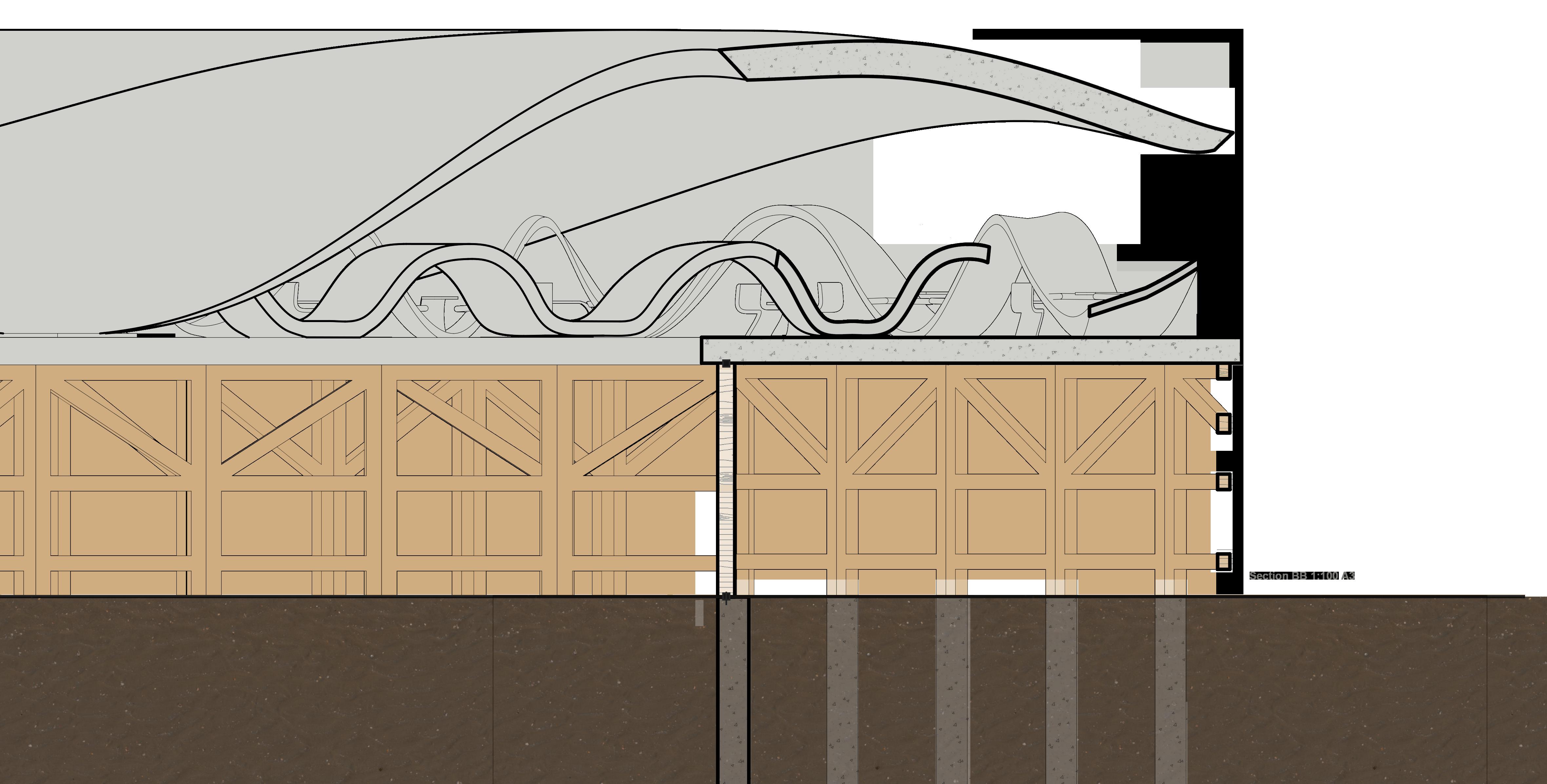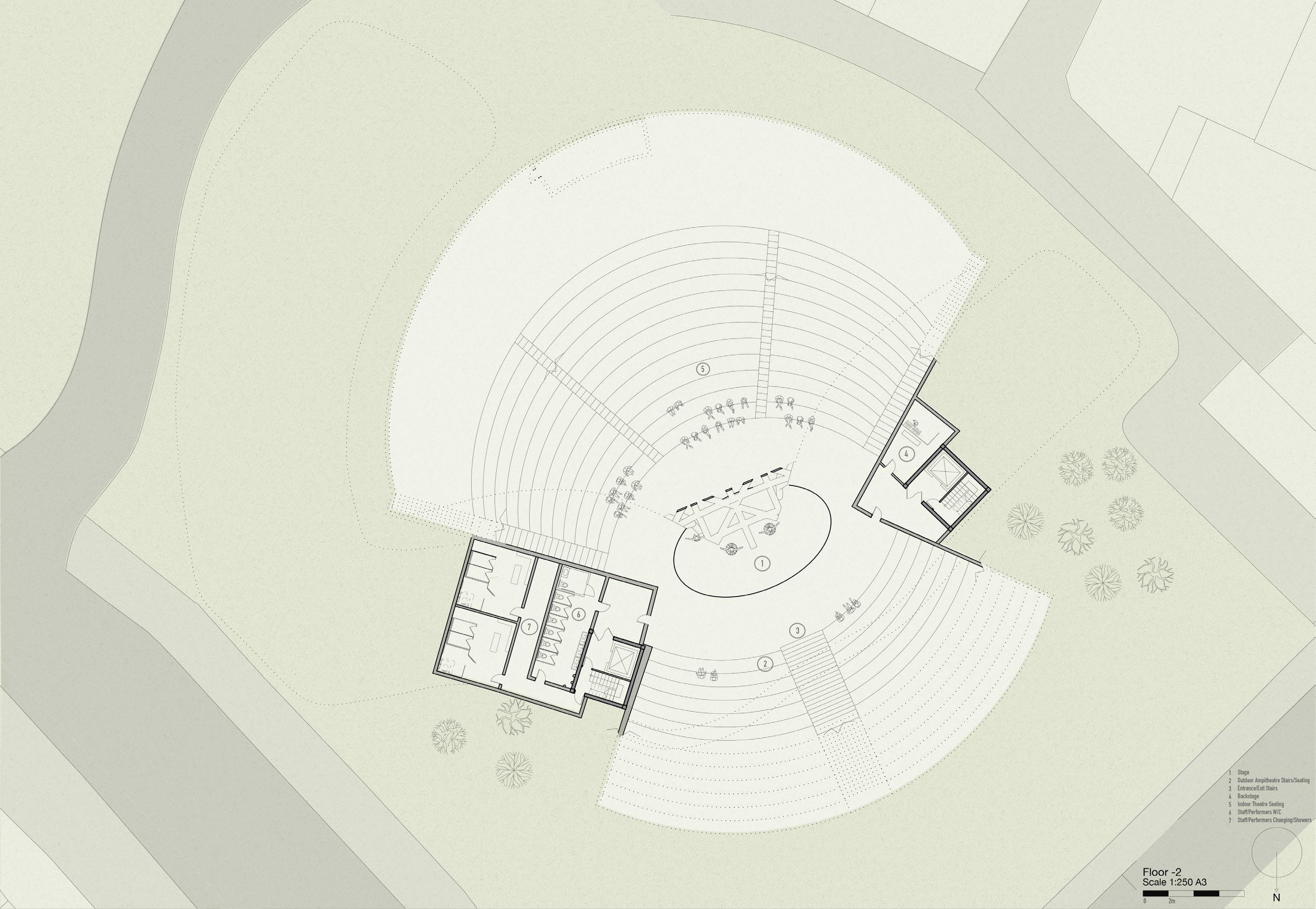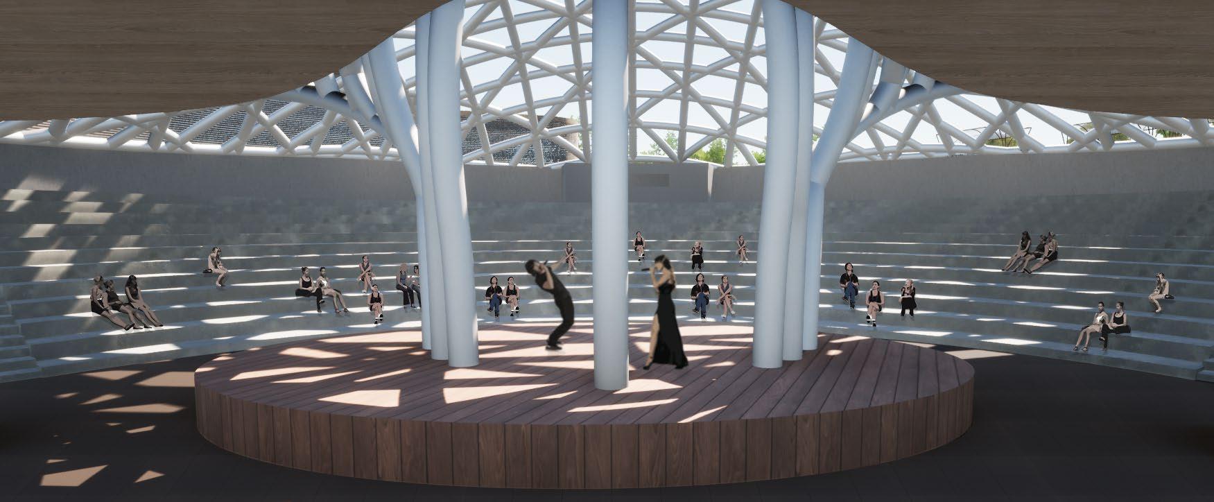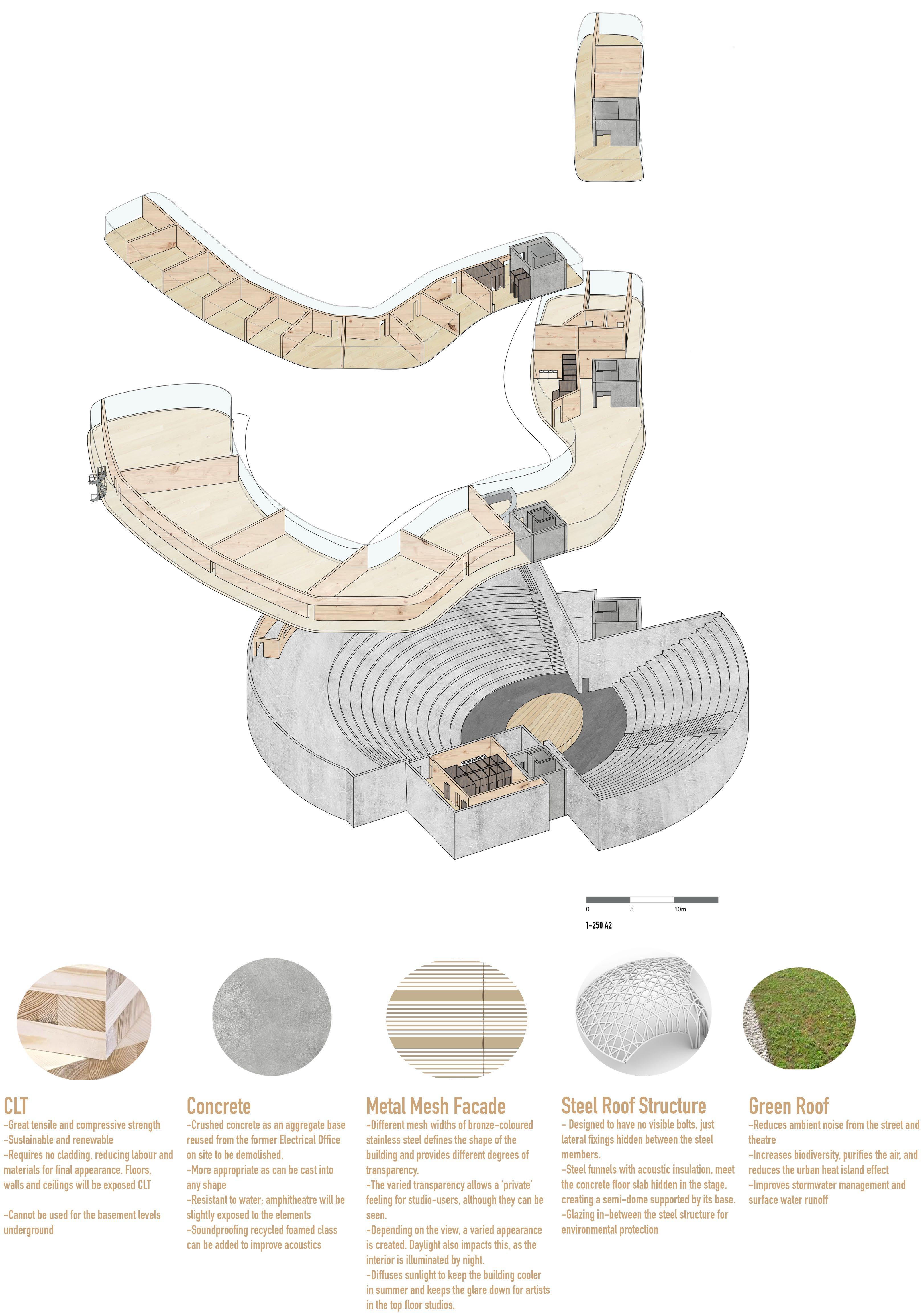 Cross Laminated Timber (CLT) is used for the majority of the building project. The CLT is to be left exposed on walls and ceilings, providing a warm exterior, and reducing the need for unnecessary extra materials. The roof structure is composed of steel funnels, that pass the load through to the substrate layer. The floor connection is then hidden within the stage, and the roof cuts the stage into two halves. One side provides a stage for the amphitheatre stairs, and the other for the indoor theatre. This allows for multiple performances to take place at once, and gives a stage that performers can weave in between the ‘feet’ of the roof structure.