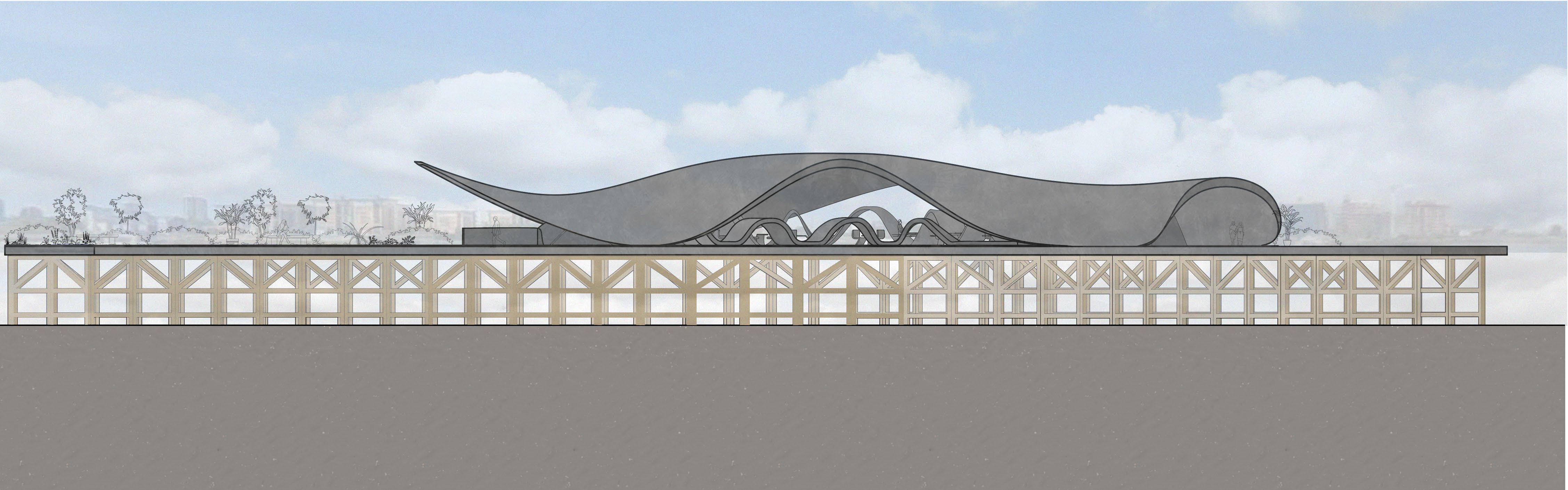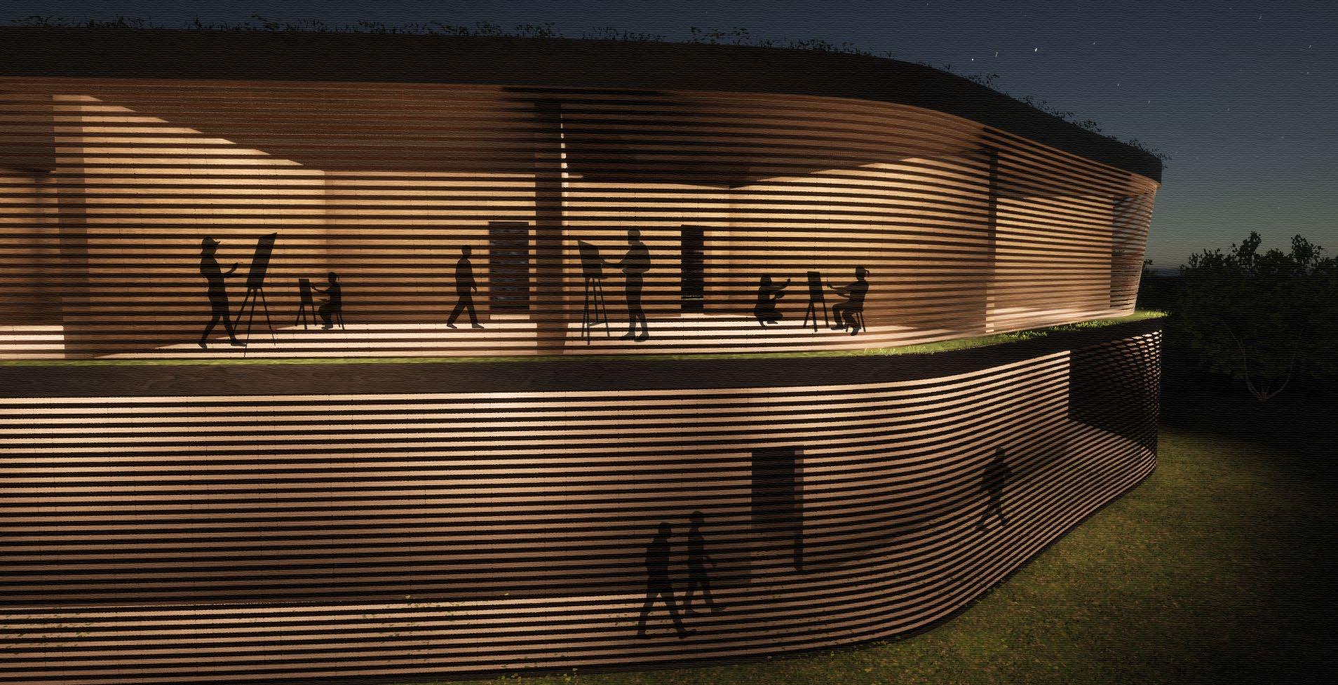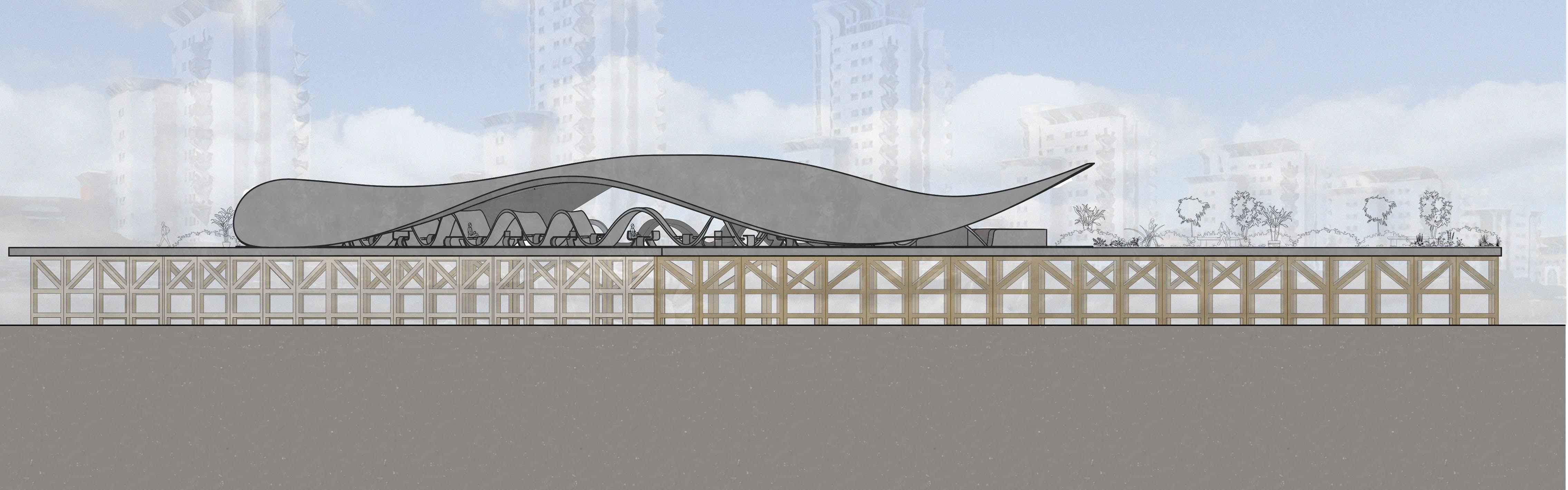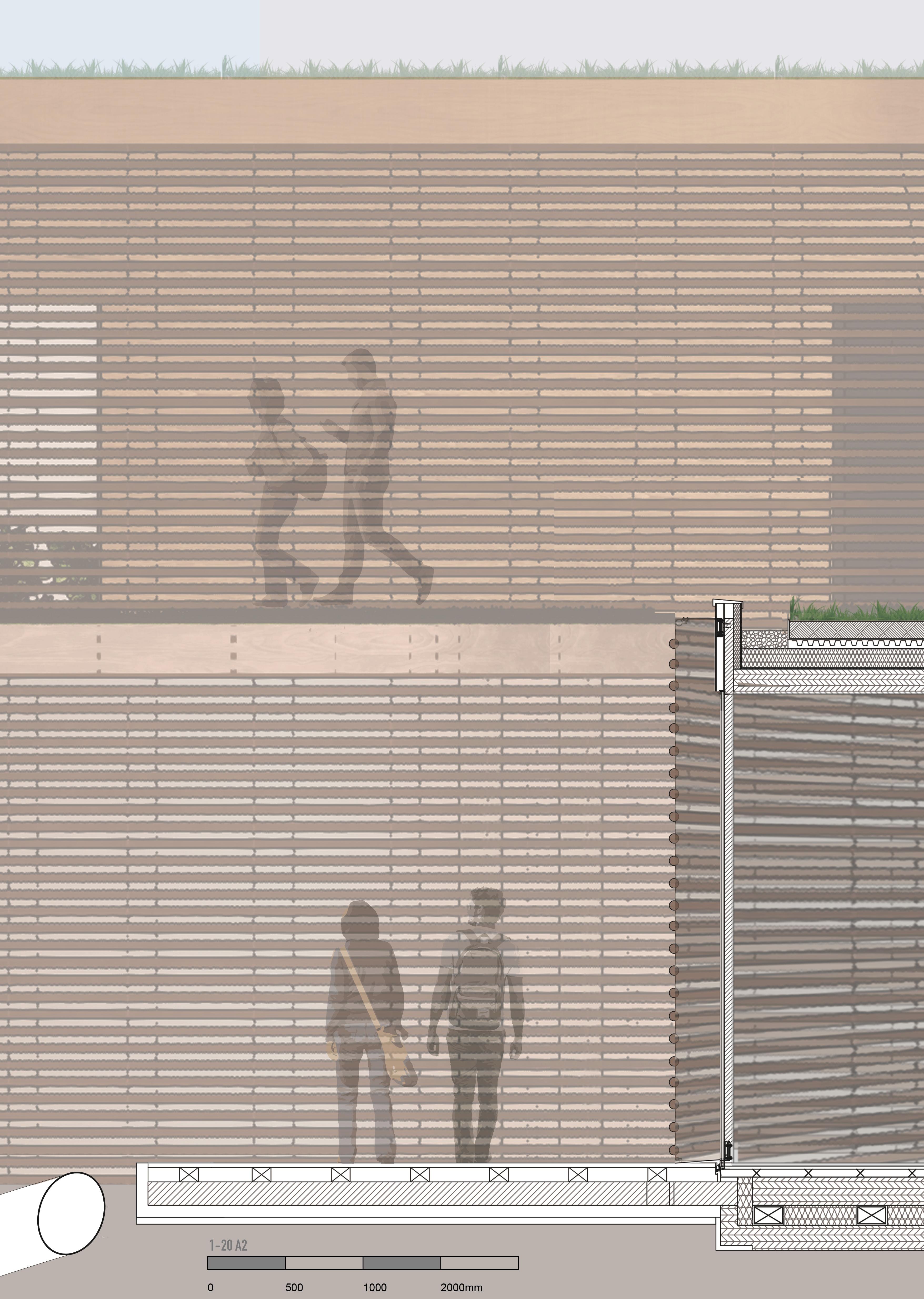 Cross Laminated Timber (CLT) is used for the majority of the building project. The CLT is to be left exposed on walls and ceilings, providing a warm exterior, and reducing the need for unnecessary extra materials. The roof structure is composed of steel funnels, that pass the load through to the substrate layer. The floor connection is then hidden within the stage, and the roof cuts the stage into two halves. One side provides a stage for the amphitheatre stairs, and the other for the indoor theatre. This allows for multiple performances to take place at once, and gives a stage that performers can weave in between the ‘feet’ of the roof structure.