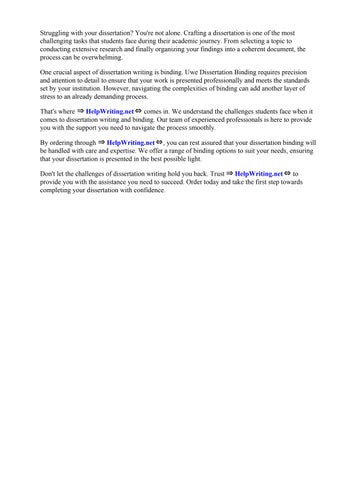 That's where ⇒ HelpWriting.net⇔ comes in. We understand the challenges students face when it comes to dissertation writing and binding. Our team of experienced professionals is here to provide you with the support you need to navigate the process smoothly.