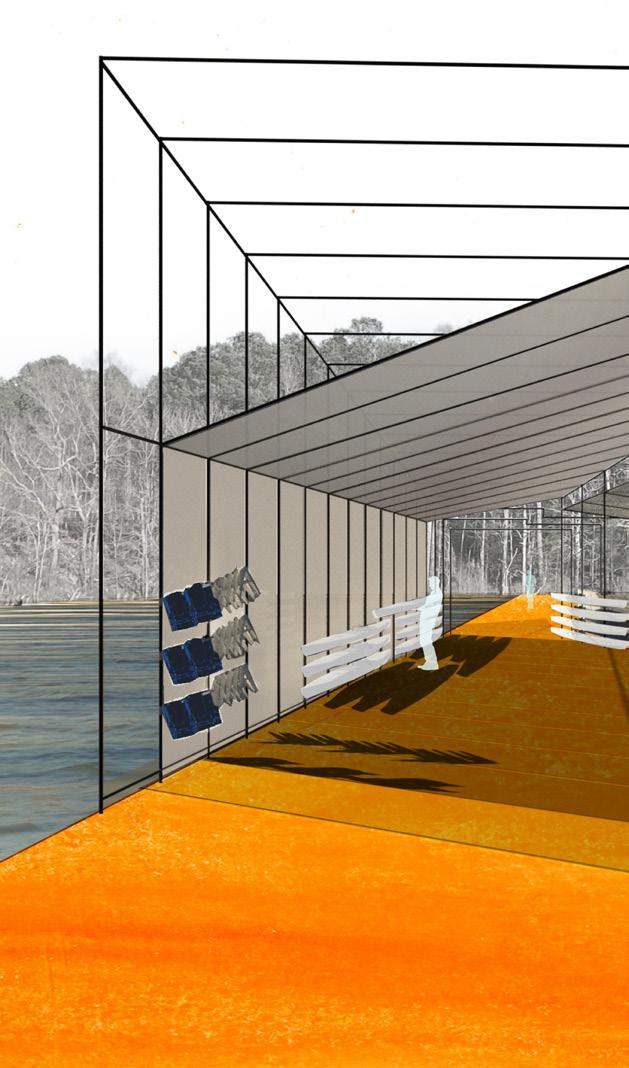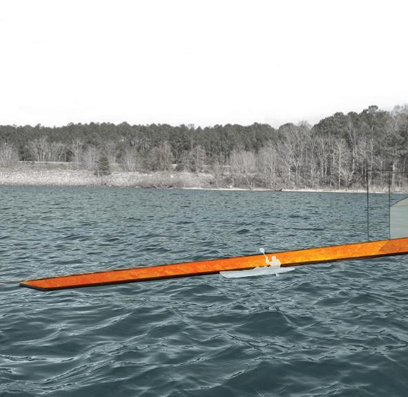 The Launch is designed to celebrate the sport of rowing. This delicate, yet provocative structure, frames views towards both sides of Jordan lake. This boathouse acts as a threshold and meeting point for both private rowers and public interest. Light materials were chosen to combat the constraints of budget and lessen the environmental footprint, while also taking into account assembly and potential disassembly.