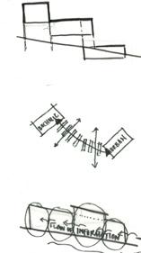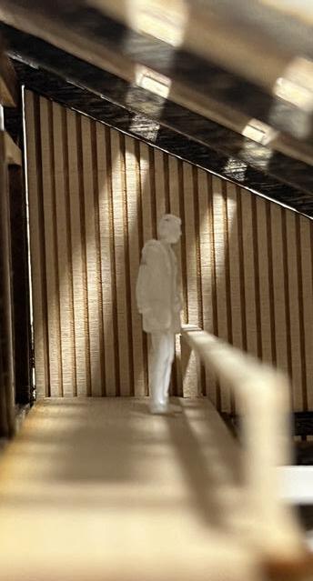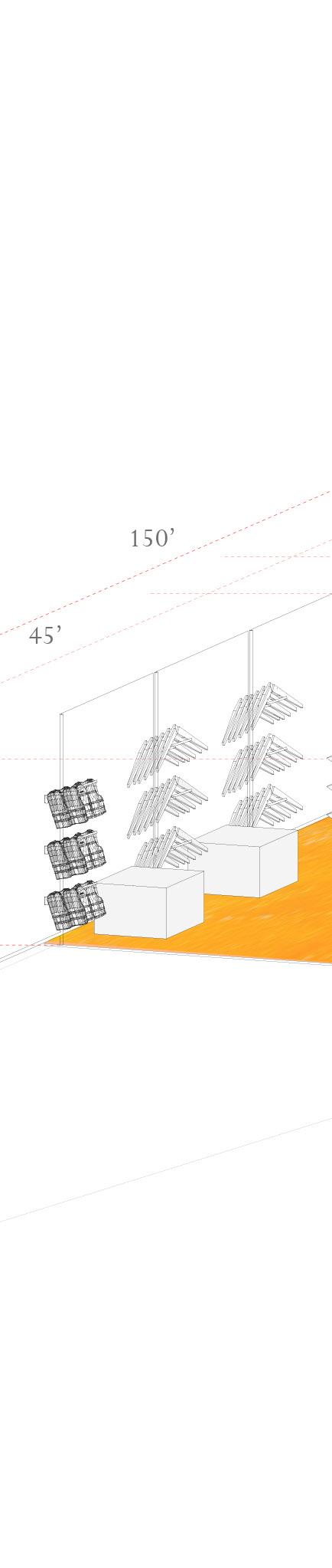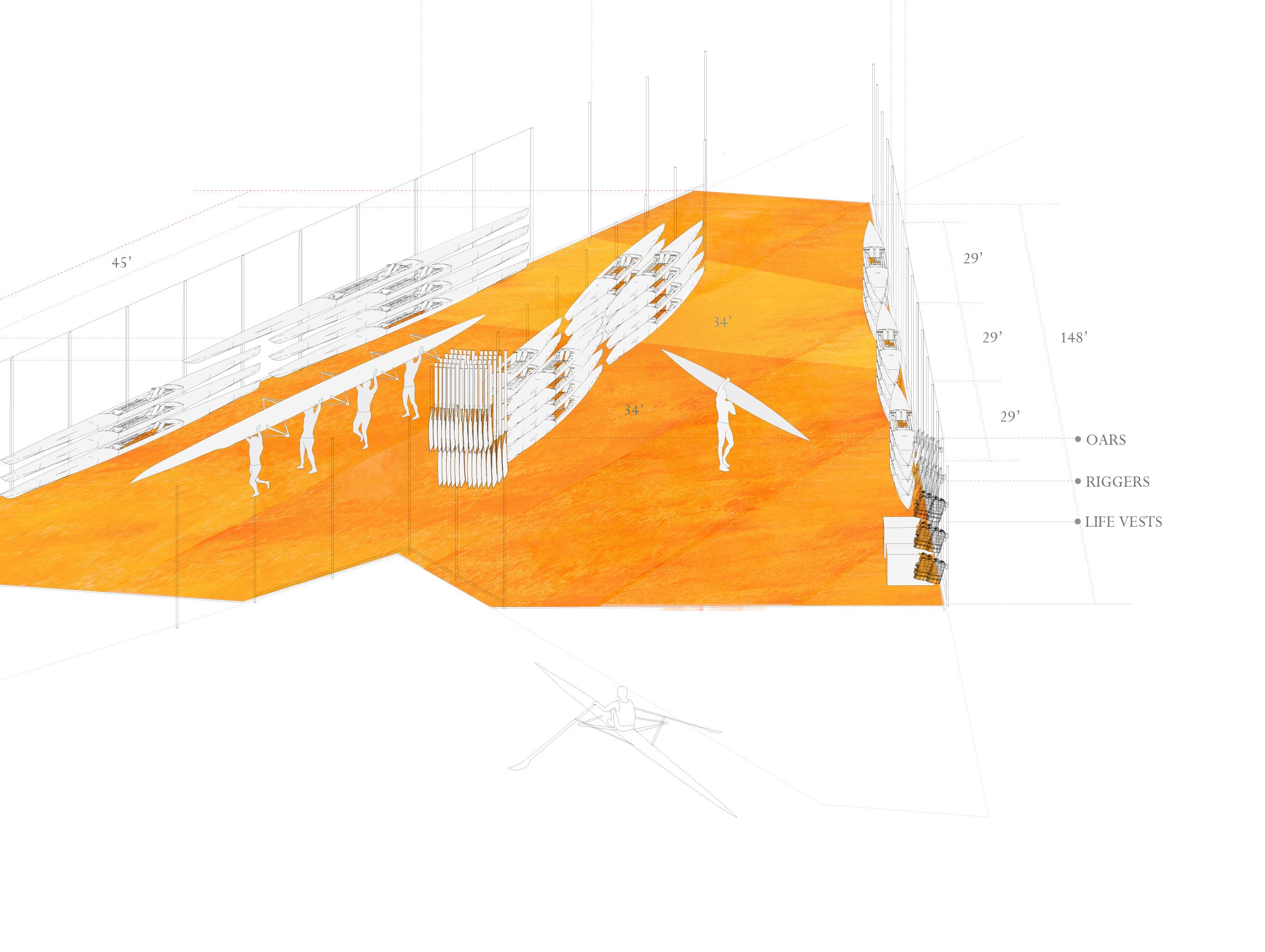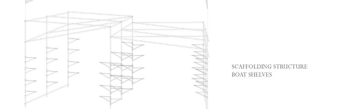Inspired by rowing’s precision, our design mirrors a telescope, with scaffolding forming two tapering arms on each side of the lake. As one moves deeper into the lake, the frames expand, turning a private shelter into a bustling Instead of a traditional lighthouse lamp, we utilized vibrant fabric as our striking visual marker. While this structure is meant to address boat storage, our design proposes a space where rowers can feel a sense of pride.