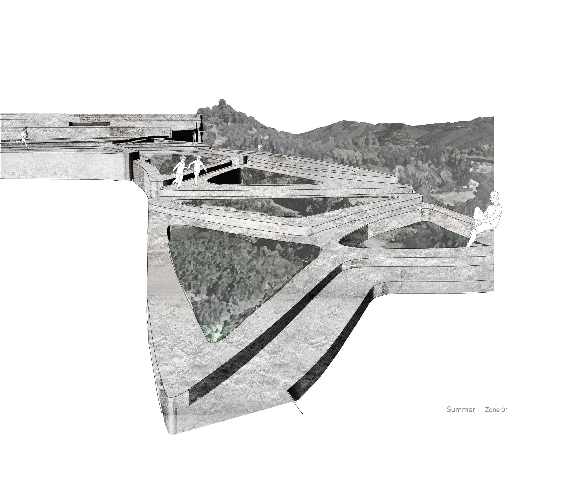 Inspired by indigenous agricultural practices, this natural system acts as an aquifier, bringing farming to the city through living terraces. Where mountain runoff is purified through the process of aeration and sedimentation.