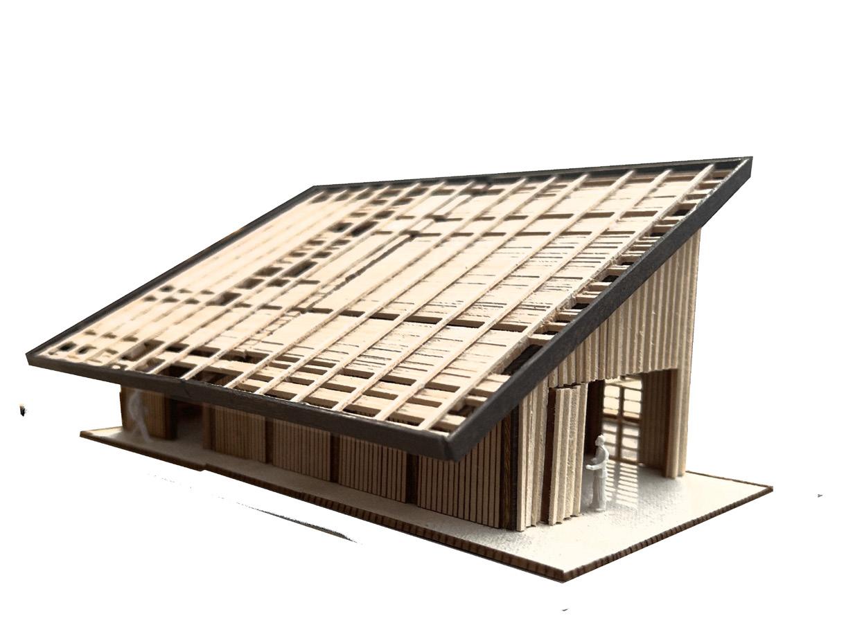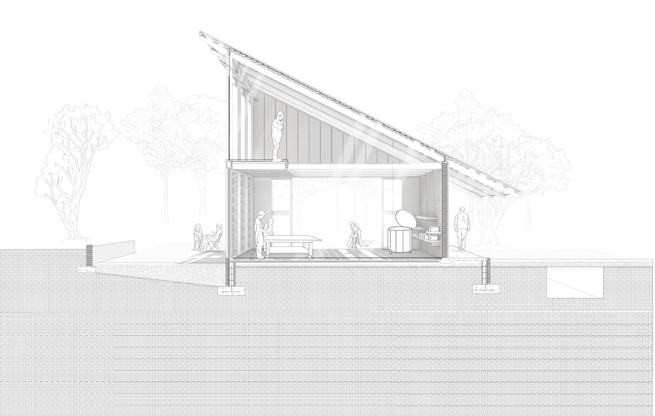 Studio Sun’s design is rooted in the natural cycles and elements of Seagrove, North Carolina, a place known for its clay-rich landscapes and pottery tradition. Created for renowned potters Hitomi and Takuro Shibata, the studio engages directly with the land and climate through a carefully orchestrated open-air structure. With no walls, the 24 x 48’ studio relies on the roof as the primary element to define and shape the space.