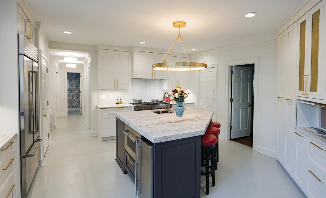 BELOW The remodeled chef’s kitchen features leathered granite countertops, a painted floor and a brass circular light.