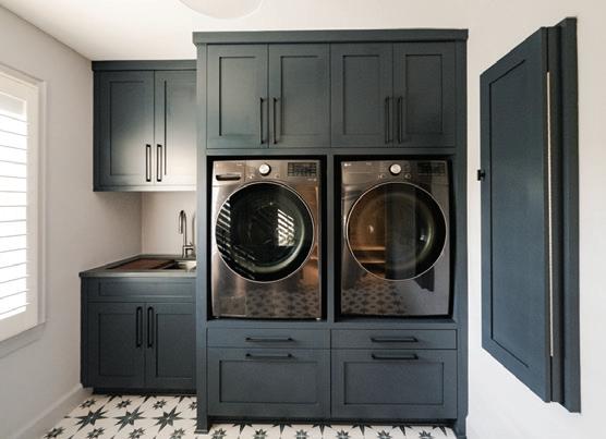 BELOW LEFT The laundry room updates include many functional details and custom cabinets painted a deep blue-gray.