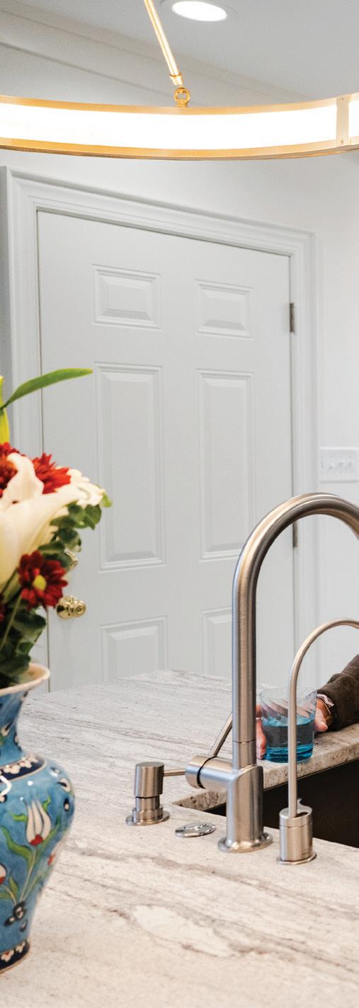 Suspended above the island is an antique brass circle of light imprinted with a geometric pattern. “The light fixture was one of the first choices that was made, and it helped to define the rest of the space,” Carol Ann says.