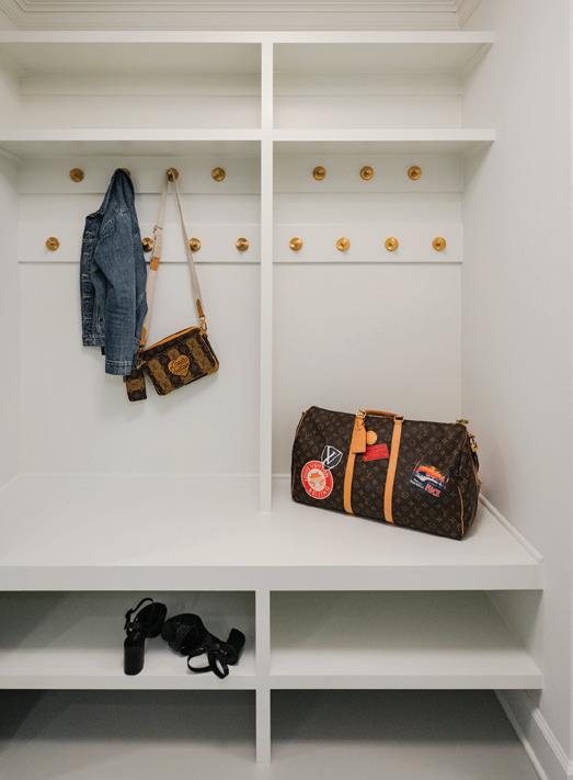 Only steps from the kitchen is a connecting hallway with a roomy storage closet and a built-in mud bench with brass hanging hooks and storage cubbies. Opposite the bench is the stylishly renovated laundry room. “I’m really obsessed with laundry because of what I do for a living,” Julie says about being a buyer for her five clothing stores. “I’m known for being able to get any stain out of anything.”
