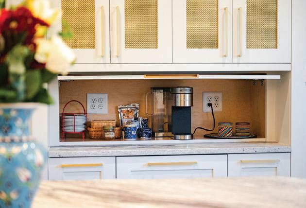 The new color palette is gray and white with pops of burgundy and brass. The room’s unique layout features a long diagonal wall of white upper cabinets with brass mesh inserts above an appliance garage. Flanking the cabinets are two vertical pullout pantries. The kitchen is spacious enough for a large center island plus two separate sinks, dishwashers and waste stations. There is also an 80-bottle wine cooler, an oversized refrigerator, a chilled beverage drawer, a slideout bread drawer, a pullout potato drawer and a 48-inch wide, eight-burner Wolf range.