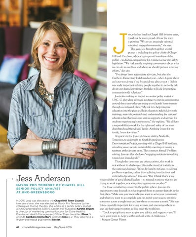 MAYO R P R O TEMPO RE O F C HA PEL HILL S E N I O R P O L I CY A N A LYST AT U N C-G R E EN SBO RO In 2015, Jess was elected to the Chapel Hill Town Council; two years later, she was elected as Mayor Pro Tempore by her colleagues. During the day, she works as a senior policy analyst at UNC-Greensboro’s SERVE Center. Her husband, Karthik Shyam, is director of marketing communications for Duke Health’s Population Health Management Office. Their daughter, Elena, 5, attends Carrboro Elementary, and son Nico is 2. They also have a 9-year-old rescue pup named Dexter. 62